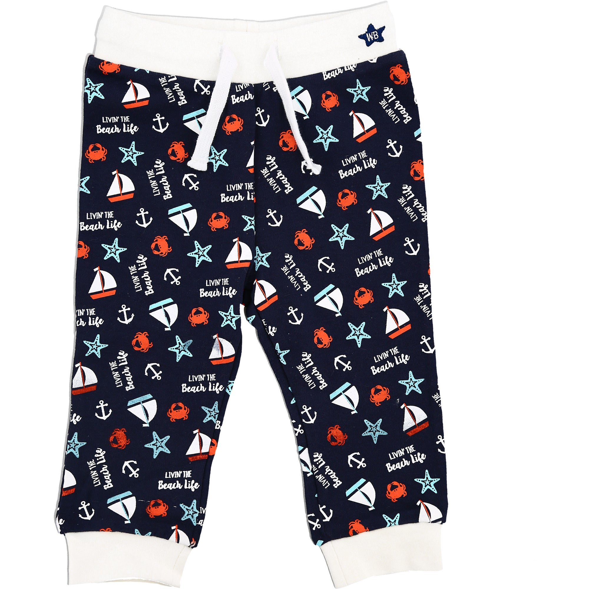 - IN-HOUSE DESIGN: The waistband has a star-shaped embroidered WB background. The red crabs, white anchors, blue starfish, and sale boat patterns accompany a repeating "Livin' The Beach Life" white sentiment.