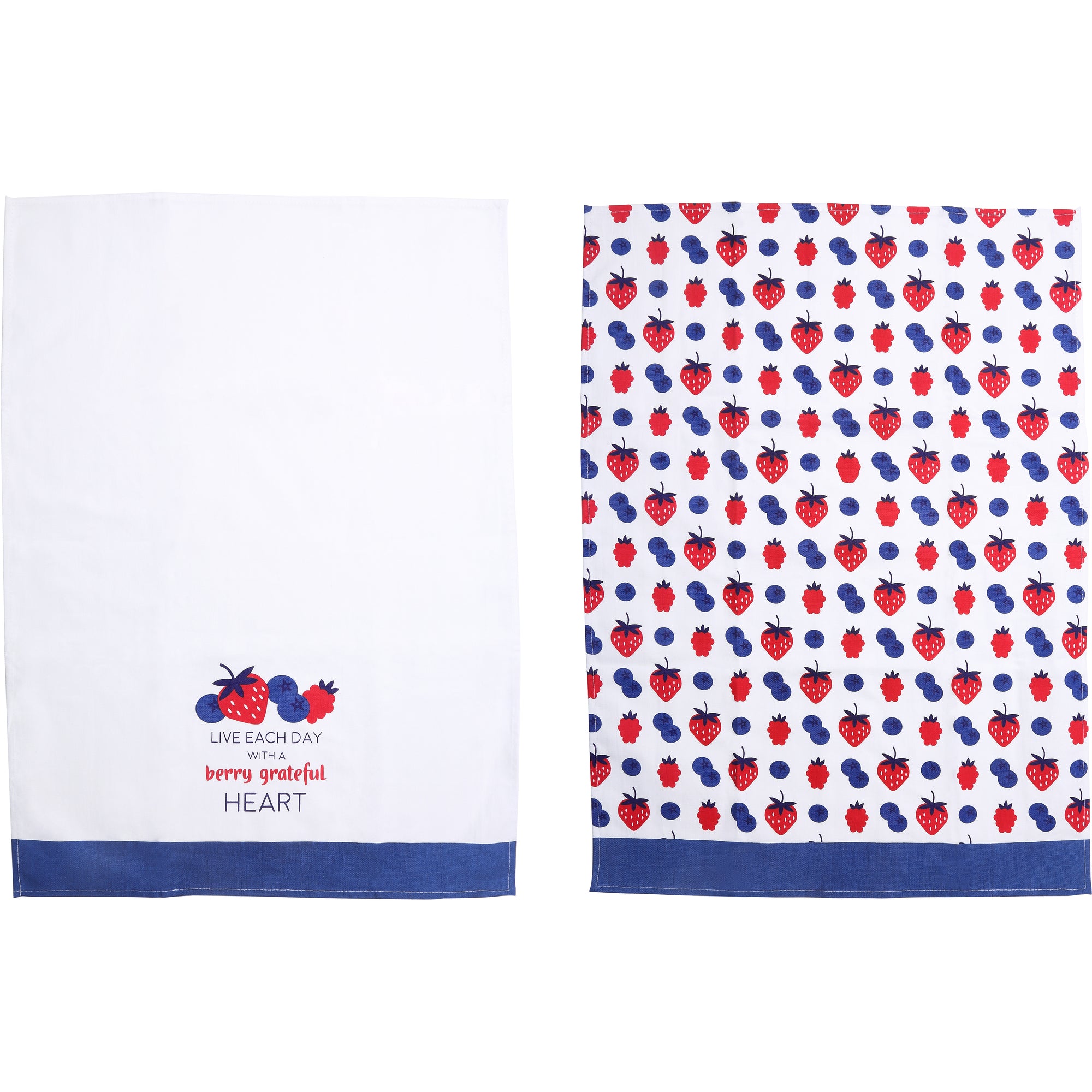 - IN-HOUSE DESIGN: "Live Each Day With A Berry Grateful Heart" text is printed onto the front of one tea towel and a blueberry and strawberry pattern is printed onto the other.