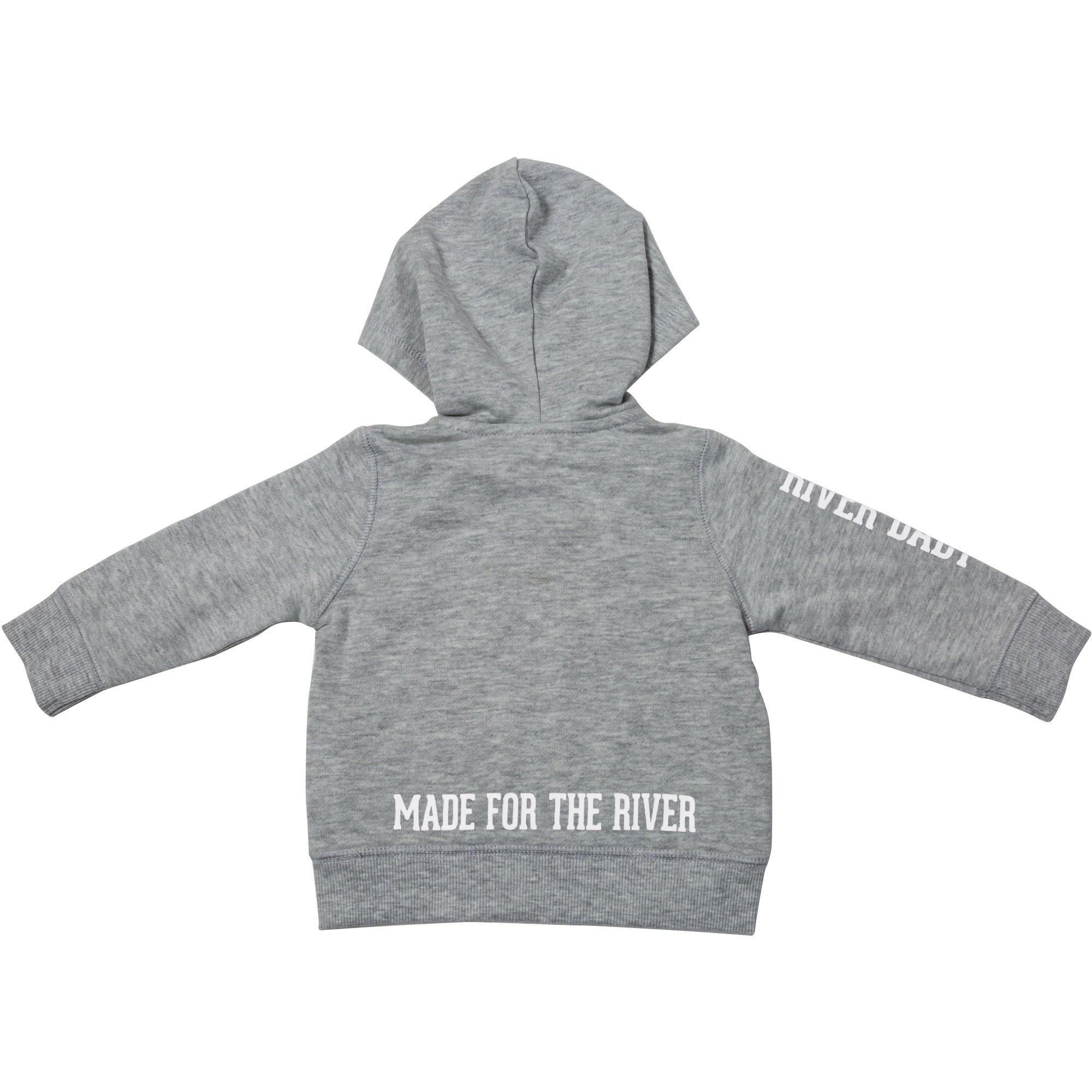 • IN-HOUSE DESIGN: "River Baby" text is printed onto the sleeve, We Baby logo and waves icon are embroidered onto the front of the hoodie, and "Made For The River" text is printed onto the back of the hoodie.