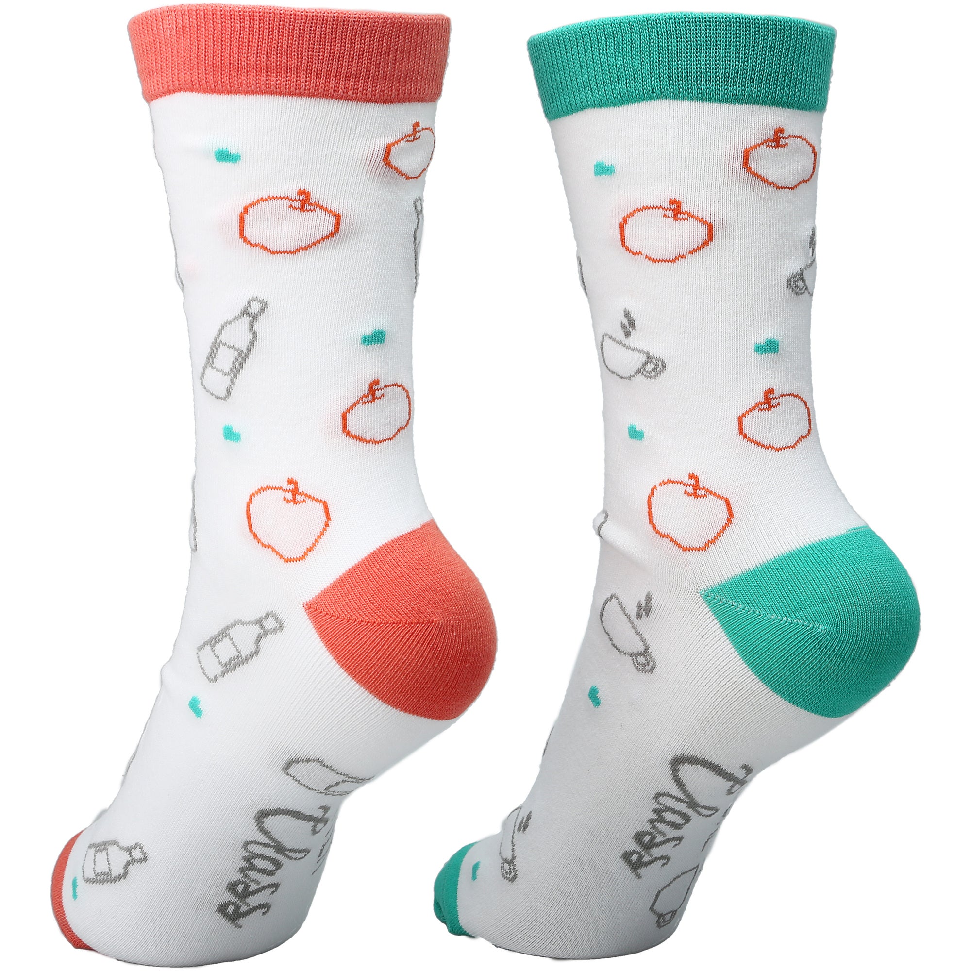 - IN-HOUSE DESIGN: Orange/green ankle, heel, and toes are attached to overall white bodies. The green sock has coffee cups, apples, and hearts with "Before Class" and a large coffee cup in gray on the bottom of the sock. The orange sock has wine bottles, apples, and hearts with an "After Class" and a large alcohol bottle on the bottom of the sock.