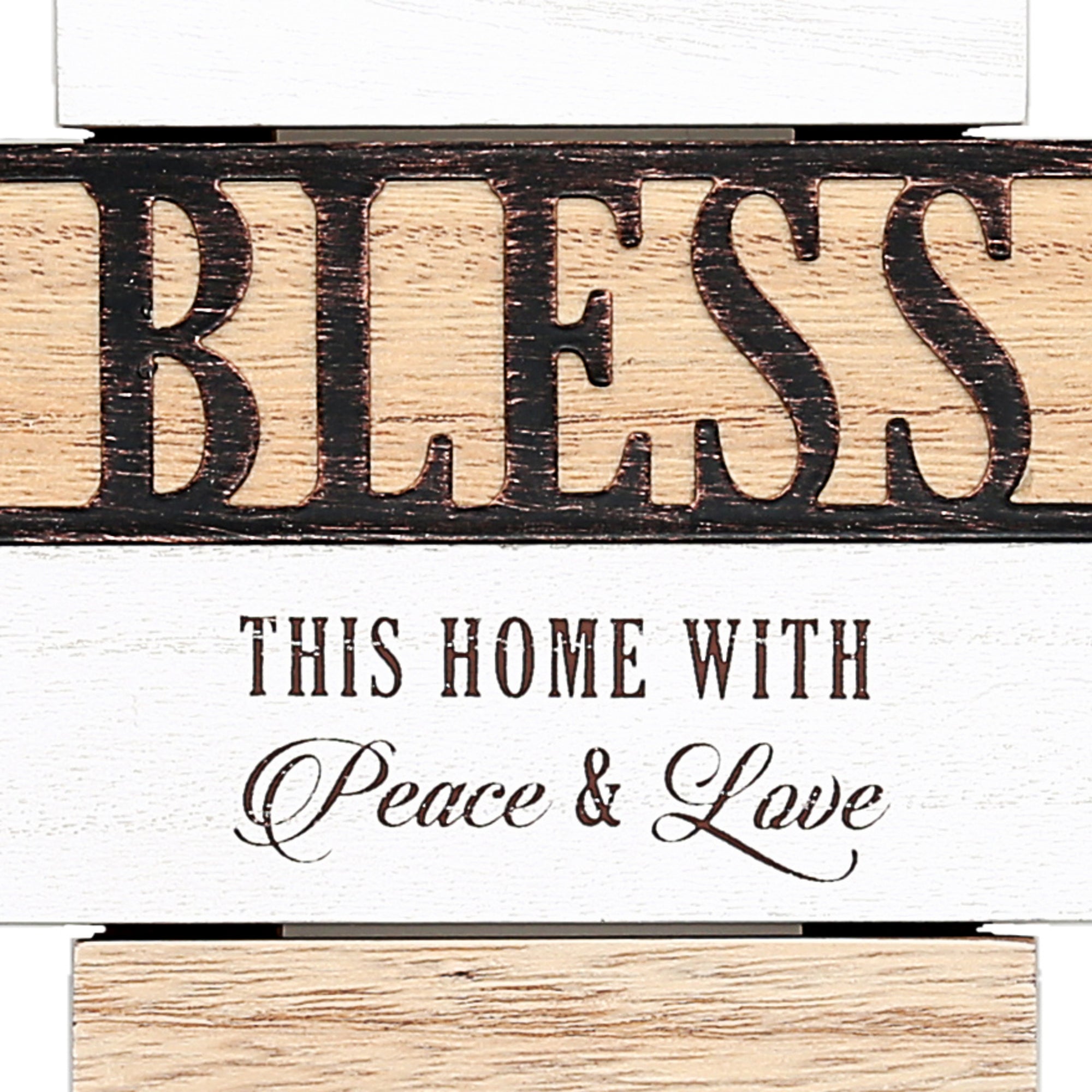 • IN-HOUSE DESIGN: The striped pattern consists of natural and white-washed wood colorations. The "Bless" is bronze metal. The "This home with peace & love" and the greenery design on the first and last sections are printed with a bronze-colored finish.