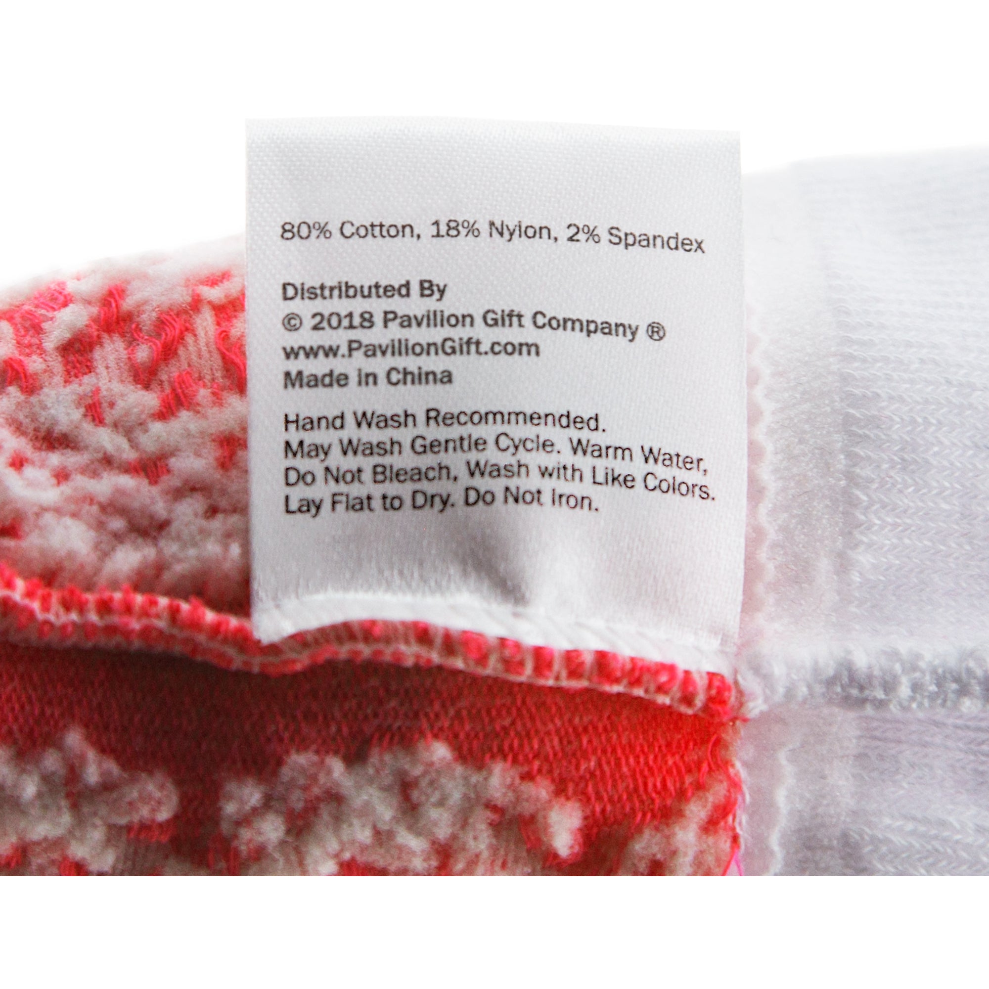 - IN-HOUSE DESIGN: "Let It Snow" text tag is sewn onto a solid white band under a red pattern.