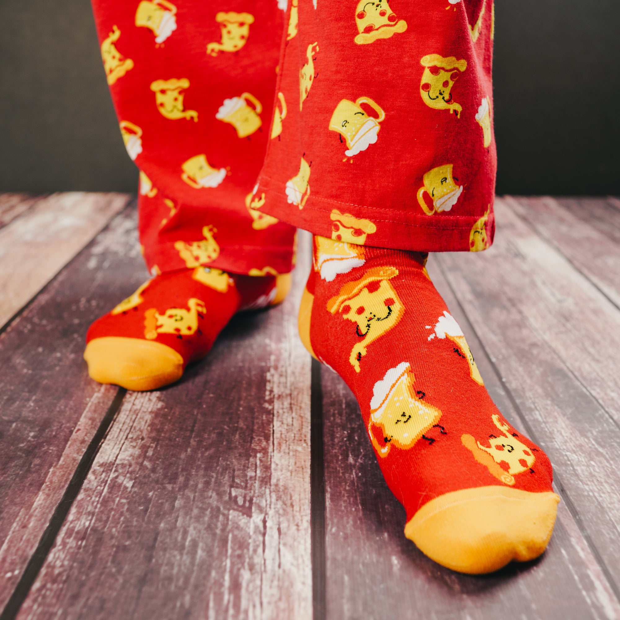 - IN-HOUSE DESIGN: Features a sewn-in pizza & beer pattern on the sock's red top and side parts. The bottom features "It's 5 o'clock somewhere" text also sewn in. The toes, heels, and ankles are a solid yellow color. Socks come packaged on a cardboard header inside of a plastic poly bag.
