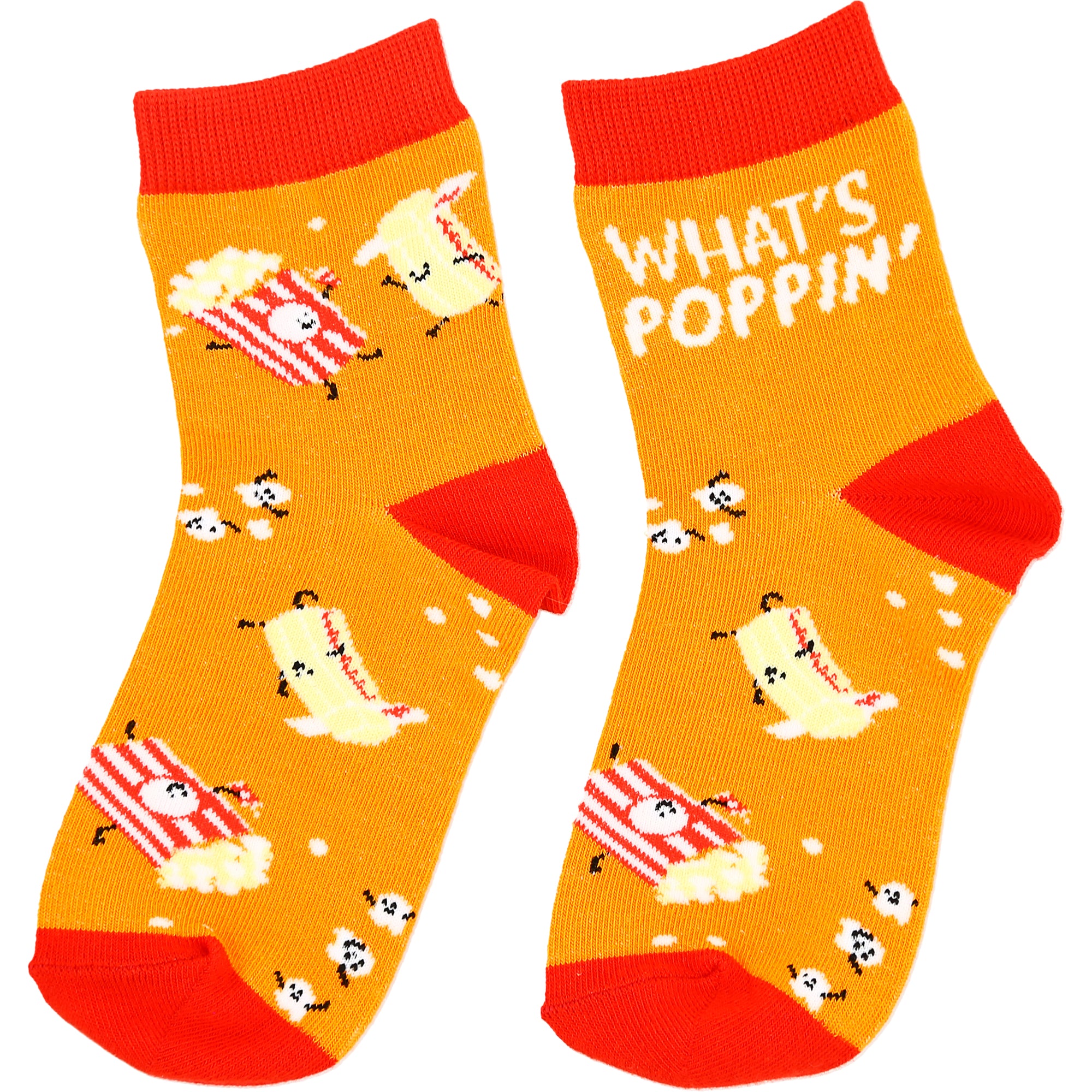- IN-HOUSE DESIGN: Features a sewn-in popcorn pattern on the orange top and side parts of the sock. The outer ankles feature “What's poppin' ” text that is also sewn in. The toes, heels and tops are a solid red color. Socks come packaged inside of a plastic poly bag with a hangtag and ribbon.