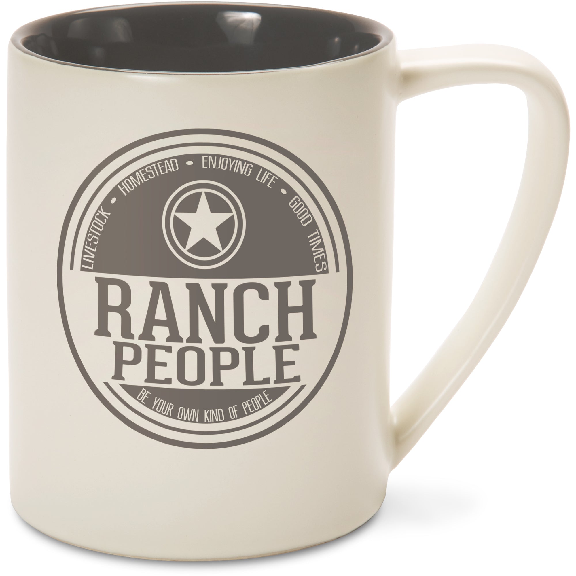 - IN-HOUSE DESIGN: "Ranch People" decal, including "Livestock - Homestead - Enjoying Life - Good Times" text is printed on both sides of the mug, as are the accompanying star logo and "Be Your Own Kind Of People" text.