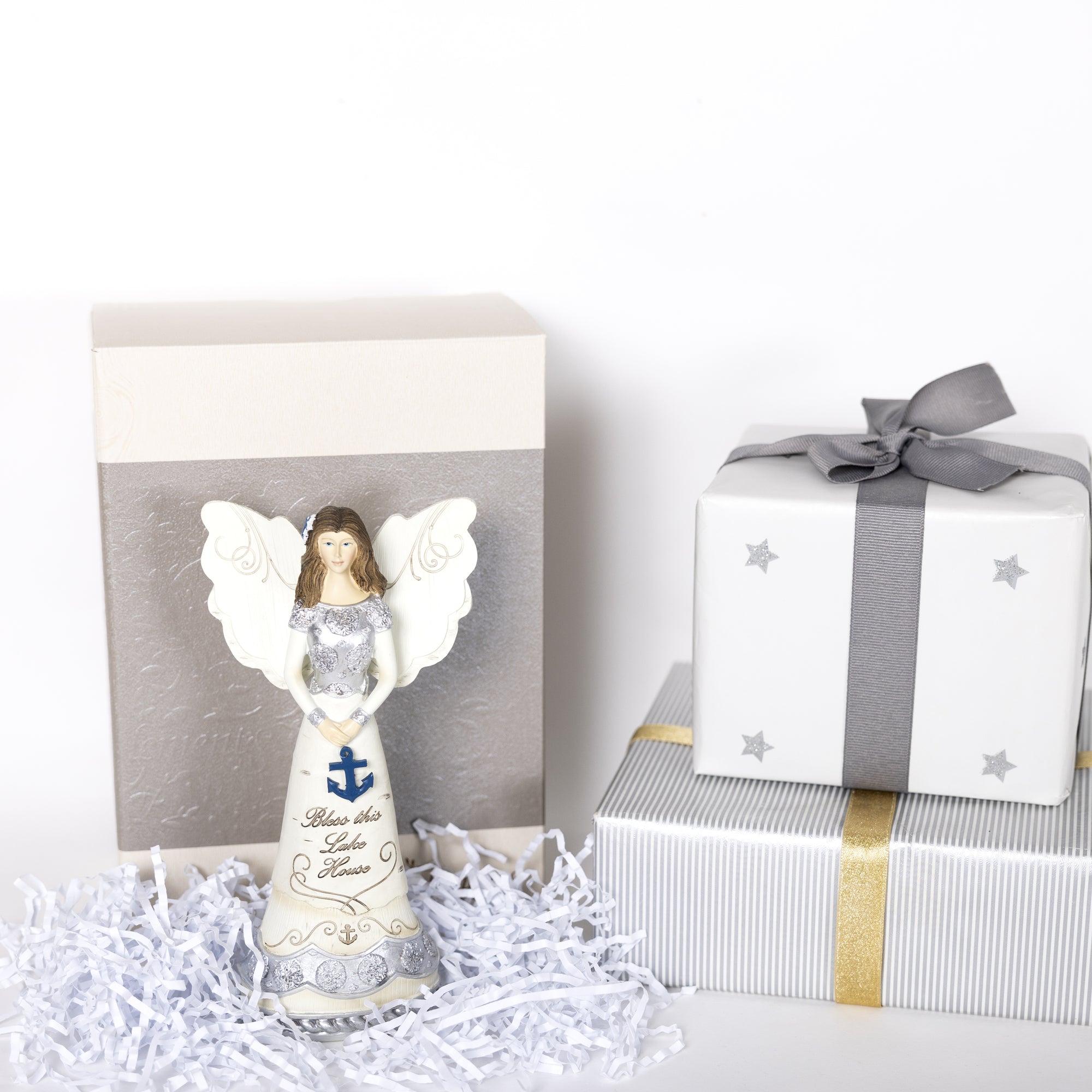 - IN-HOUSE DESIGN: The "Bless This Lake House" sentiment is carved in cursive on the center of the bottom half of the dress. The angel statue holds a moving blue anchor in her hands. Her beautiful mid-length hair rests neatly on her shoulders and back. The silver floral and damask-styled silver details bring her to life, accompanied by wave and anchor designs above.