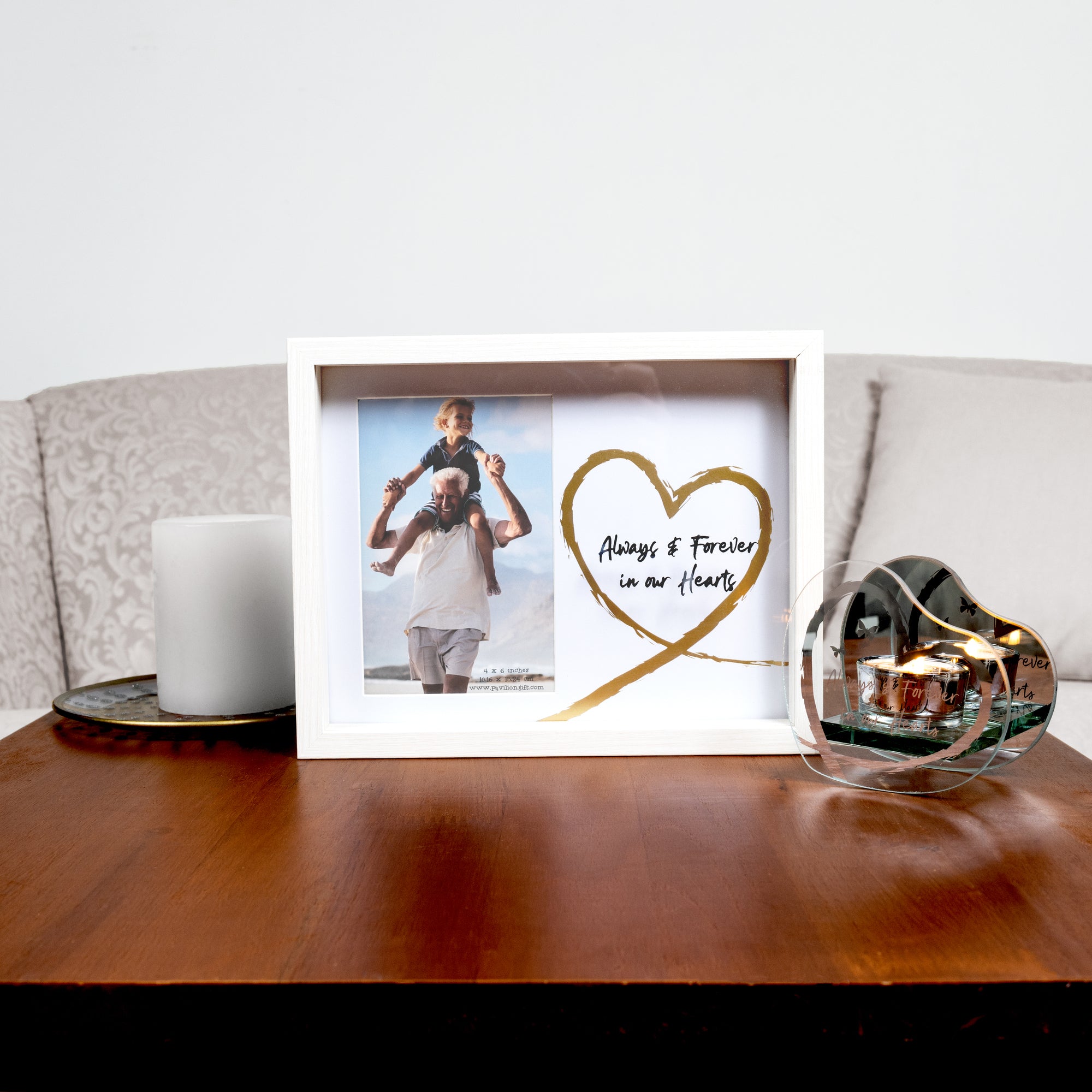 - IN-HOUSE DESIGN: "Always & Forever In Our Hearts" is electroplated among the silver butterfly and painterly heart design on the front glass piece.