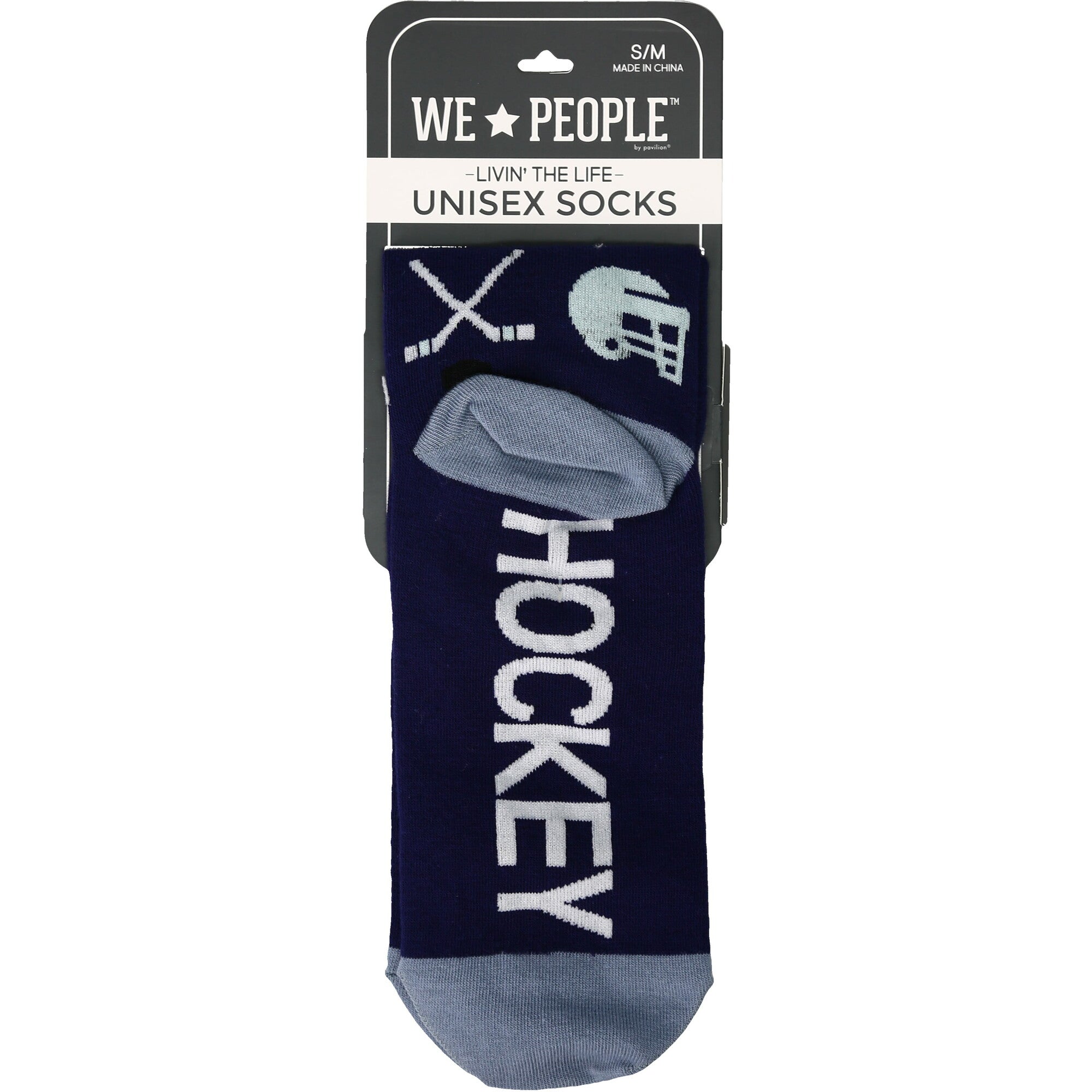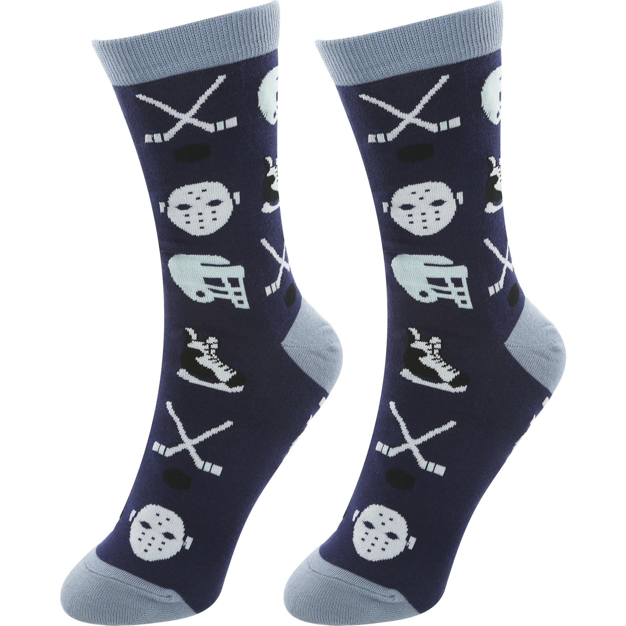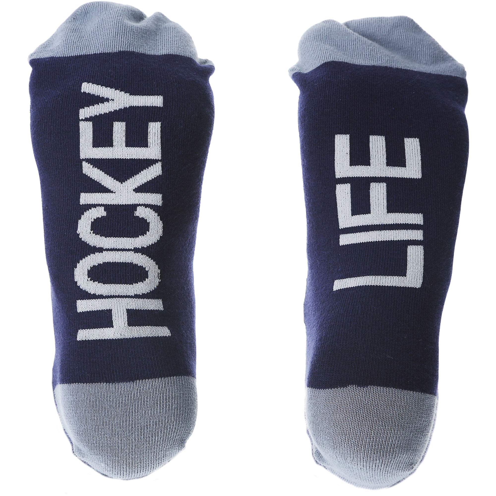 • IN-HOUSE DESIGN: "Hockey Life" text is sewn into the base of the socks while a puck, sticks, skates, helmet, and mask pattern covers the rest.