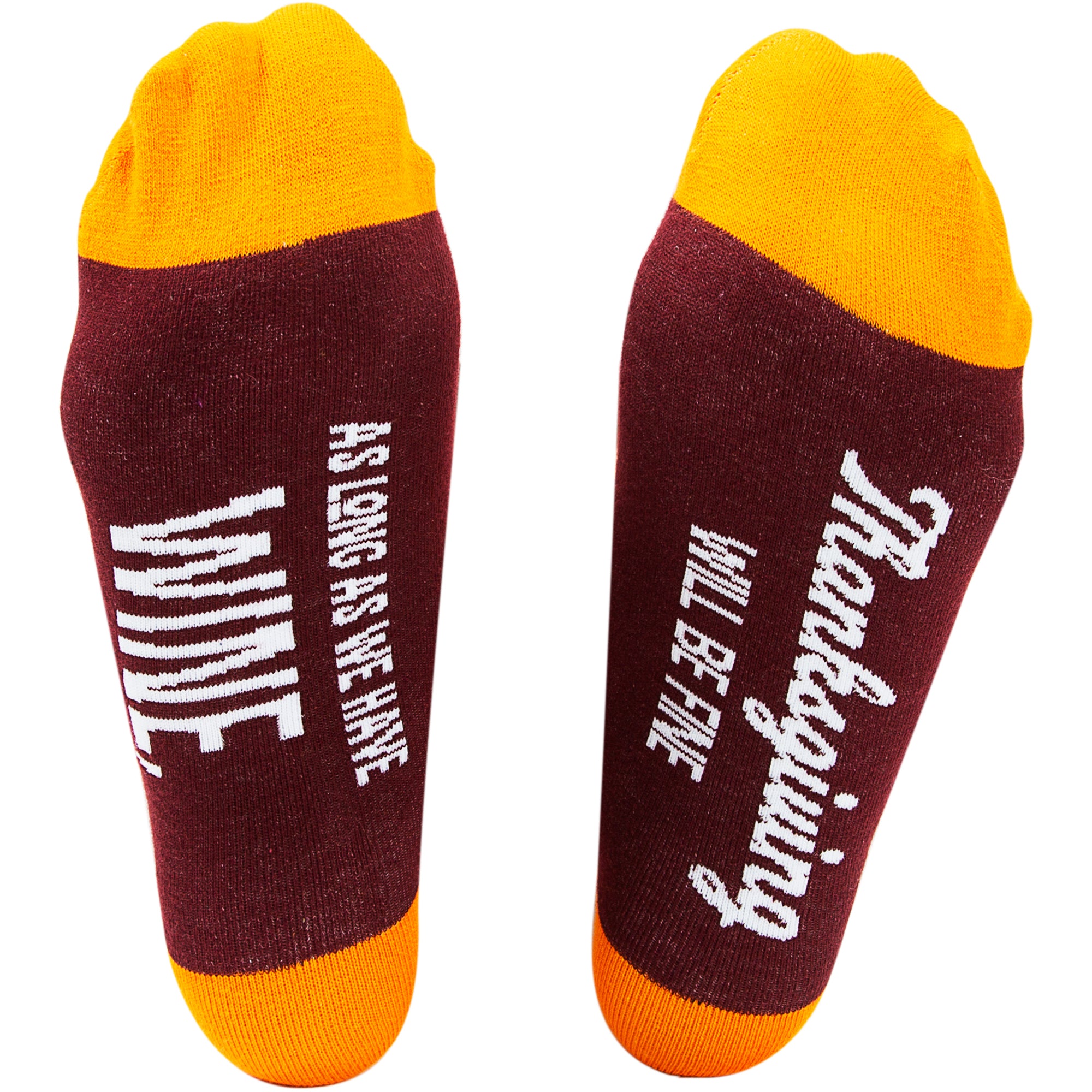 - IN-HOUSE DESIGN: "As Long As We Have Wine, Thanksgiving Will Be Fine" text decal and accompanying ghost imagery decal is applied to the front of the ornament, while socks feature sewn-in turkeys, wine glasses, slices of pie, and leaves.
