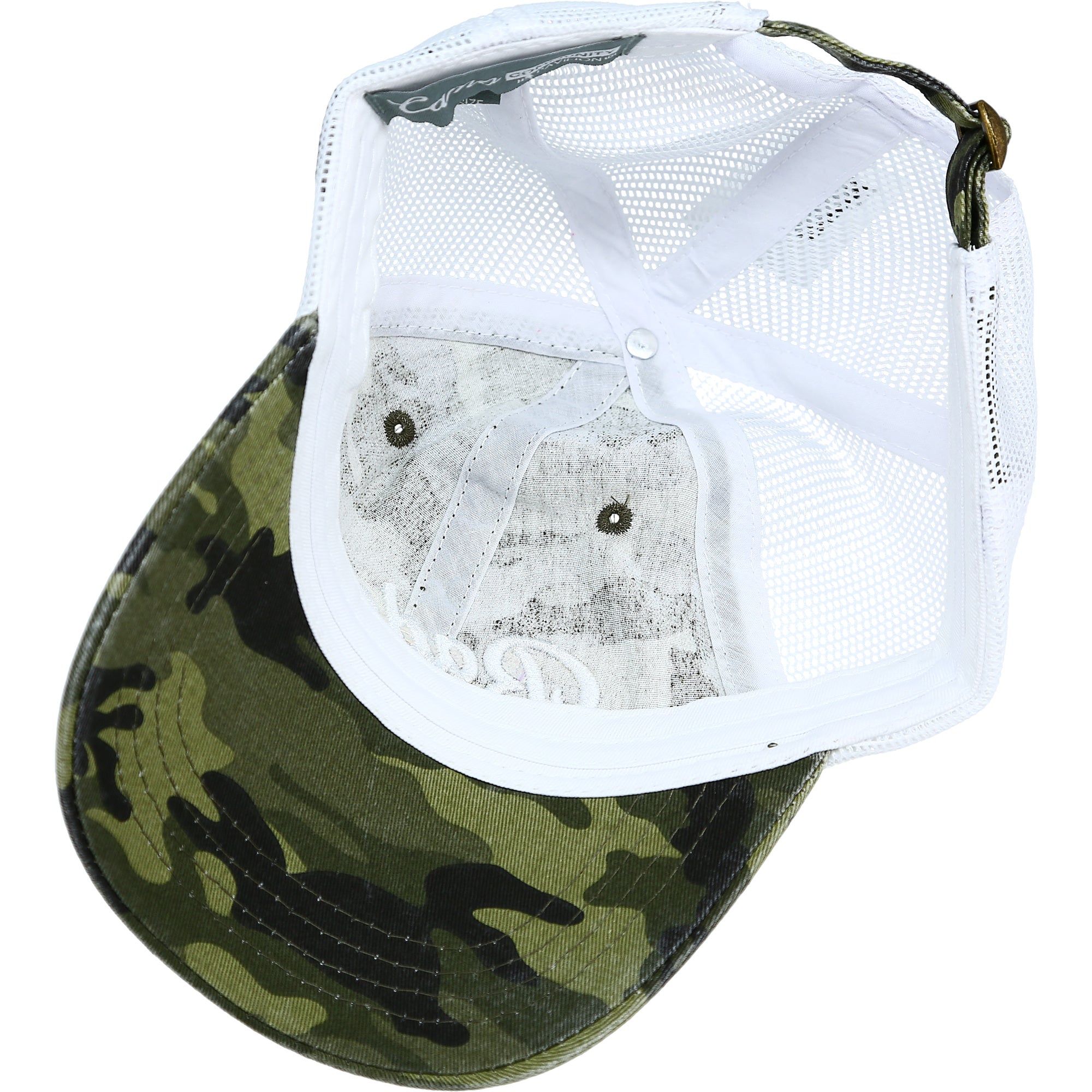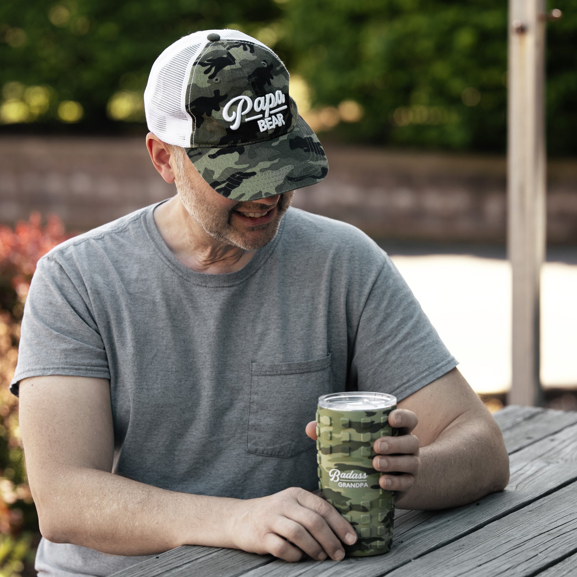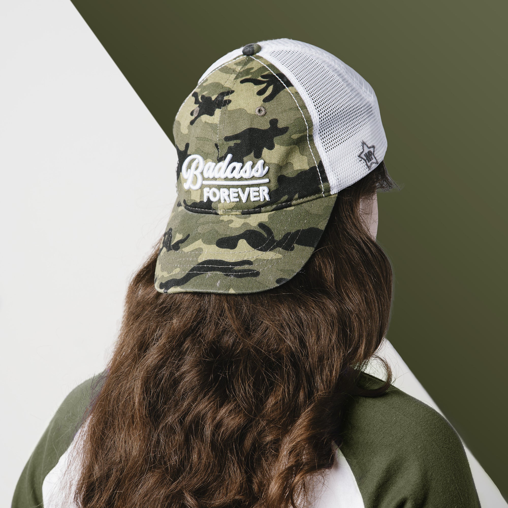 • IN-HOUSE DESIGN: Features a printed green camo patterned on the front and brim of the hat. The backing is white mesh and features a snap, along with an adjustable strap that can be tucked away. The front of the hat features a 3d embroidered patch "Badass Dad" text. Comes packaged in a polybag with a plastic j hook and hangtag.