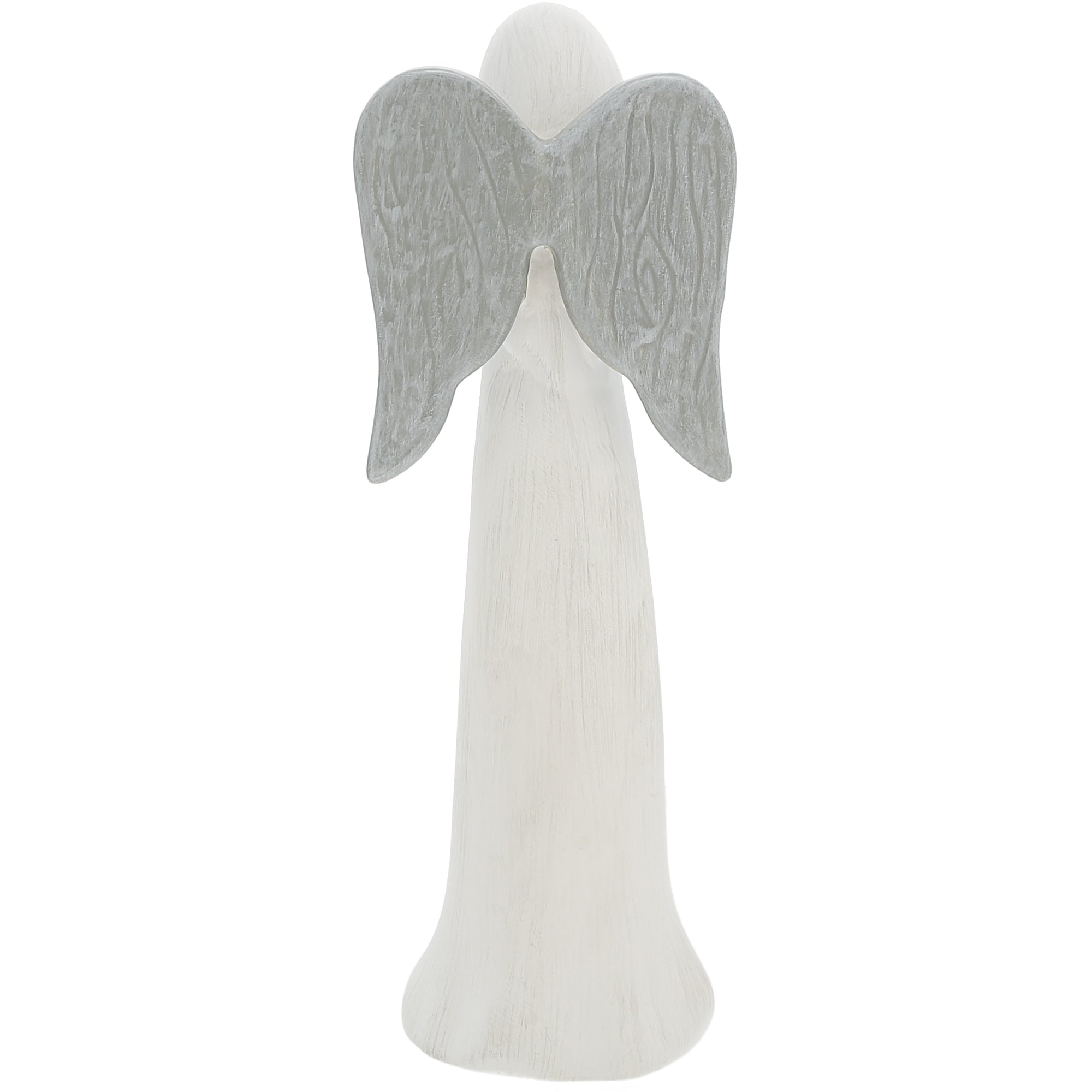 - PREMIUM QUALITY: The delicate hallowed interior 9" angel figurine is constructed from terracotta. Her long side parted hair drapes in a v down the center of her back where her gray hand wood carved patterned wings are connected. Her long dress flows seamlessly around the ground. Overall white finish with soft faded gray brushmark strokes for added dimension. She holds her hands towards the right side of her chest with a calm gray butterfly at rest in her palms.