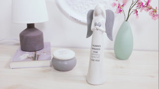 - PREMIUM QUALITY: The delicate hallowed interior 9" angel figurine is constructed from terracotta. Her long side parted hair drapes in a v down the center of her back where her gray hand wood carved patterned wings are connected. Her long dress flows seamlessly around the ground. Overall white finish with soft faded gray brushmark strokes for added dimension. She holds her hands over the center of her chest, holding a gray heart.