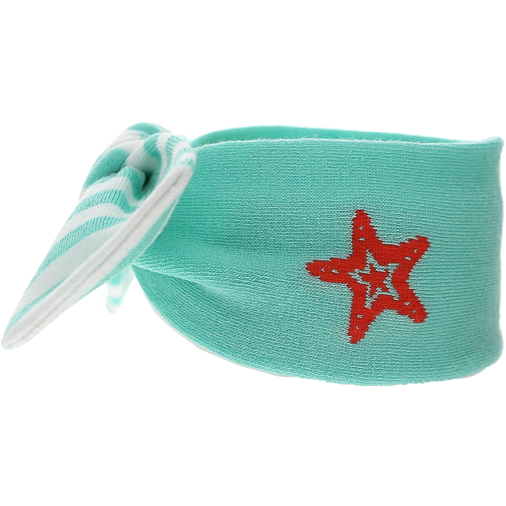 - IN-HOUSE DESIGN: The aqua blue and white striped bow can be adjusted by loosening and tightening the knot. The solid aqua-blue band has a small coral woven star design.
