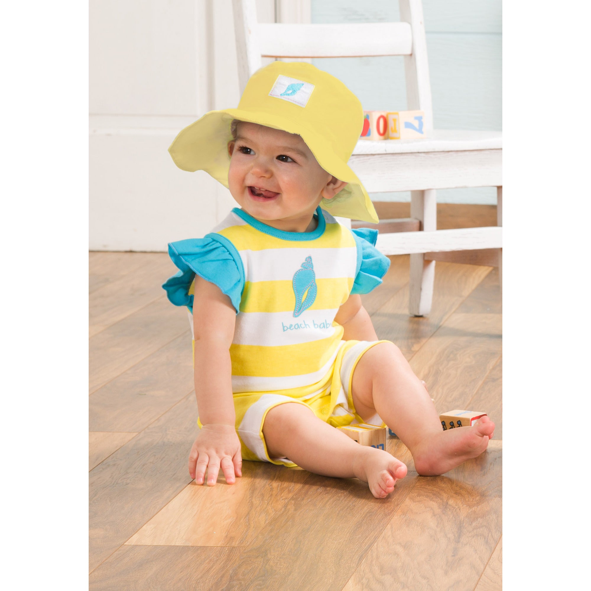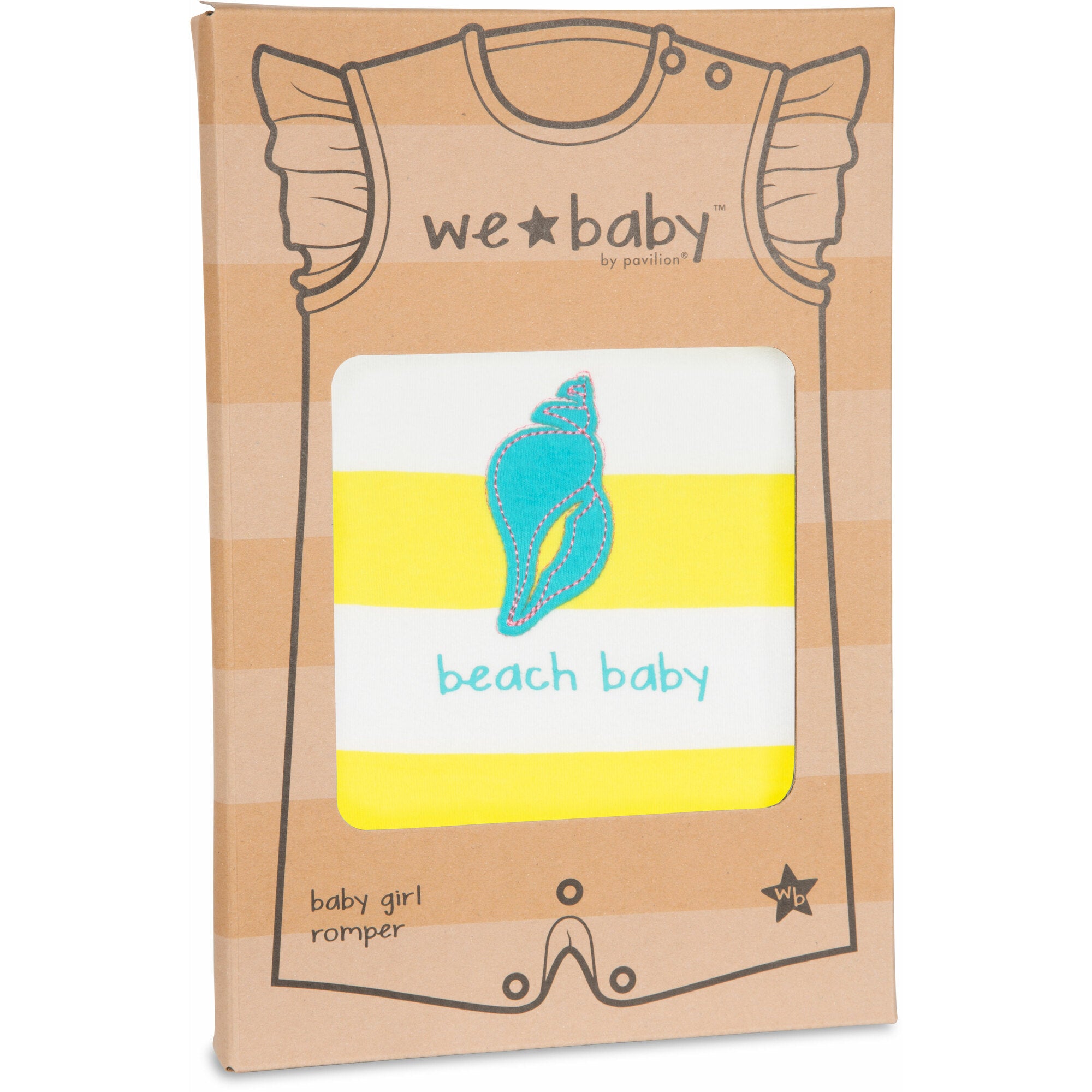 - IN-HOUSE DESIGN: "Beach Baby" text is screen printed, as is the We Baby logo on the bottom of the romper.