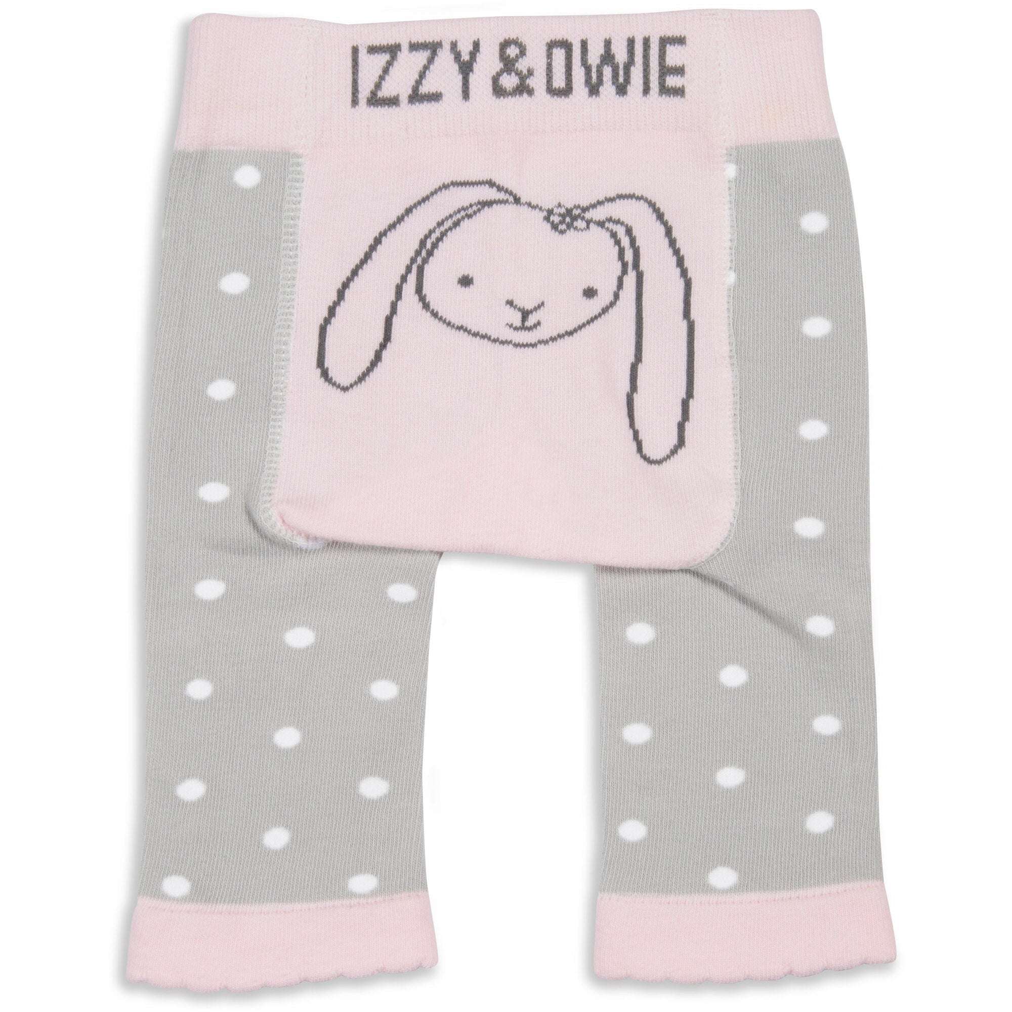 - IN-HOUSE DESIGN: "Izzy & Owie" text is sewn into the waistband, bunny image is sewn into the rear, and the dot pattern of the main material covers the rest of the leggings.
