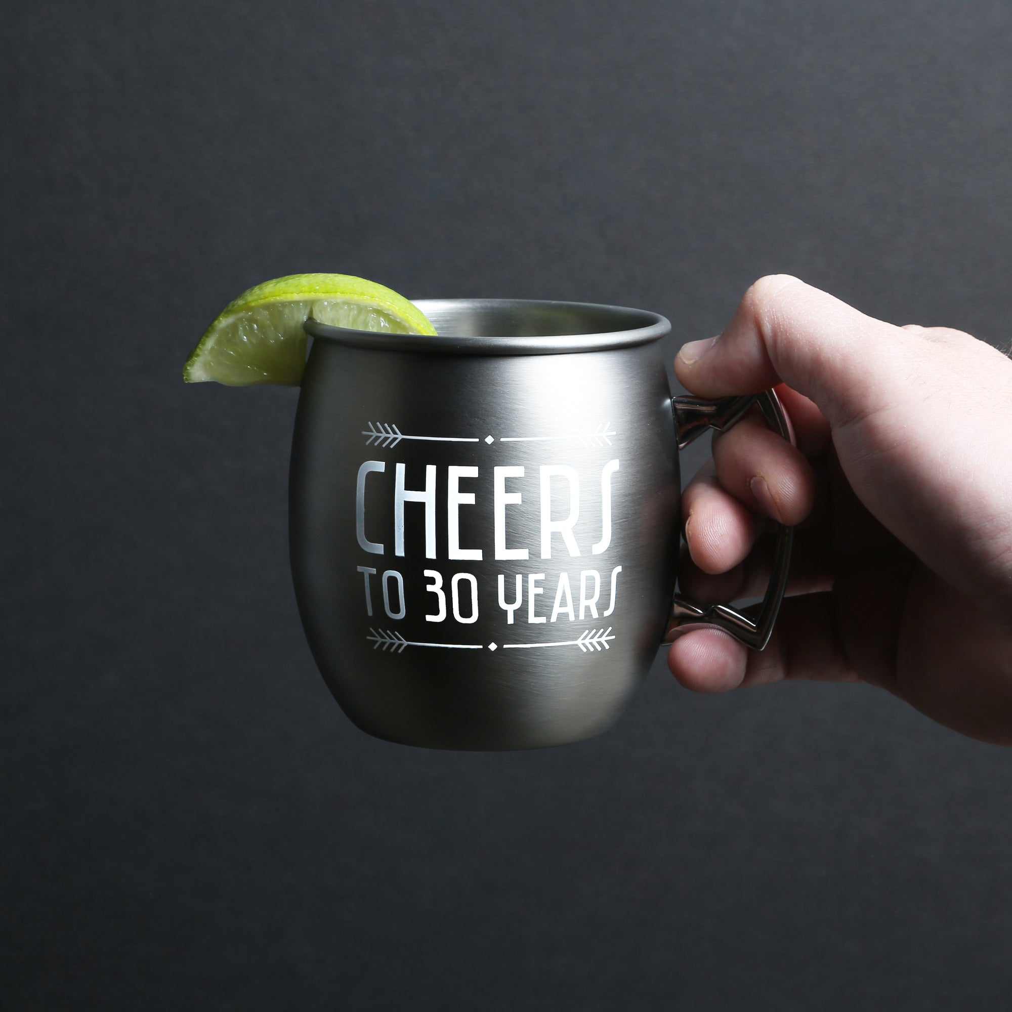 • IN-HOUSE DESIGN: "Cheers To 30 Years" text decal is applied to the front of the Moscow mule.