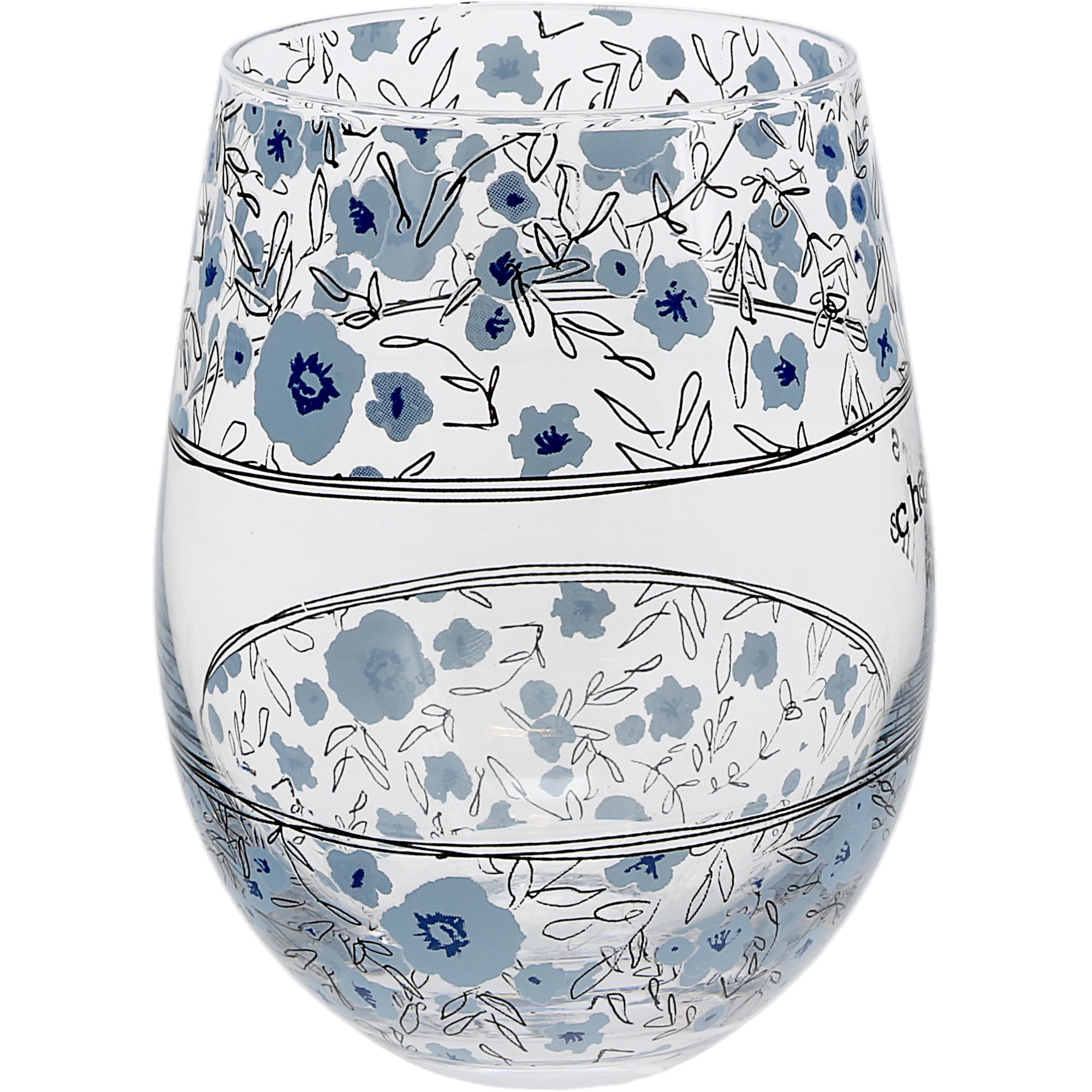 • IN-HOUSE DESIGN: The cobalt blue floral pattern is fully wrapped around the glass with an opening where the text decal is visible. "Cheers to Wine" text is applied to the front of the glass. The artwork was designed by artist AmyLee Weeks, who has always loved sheer, soft, and happy colors.