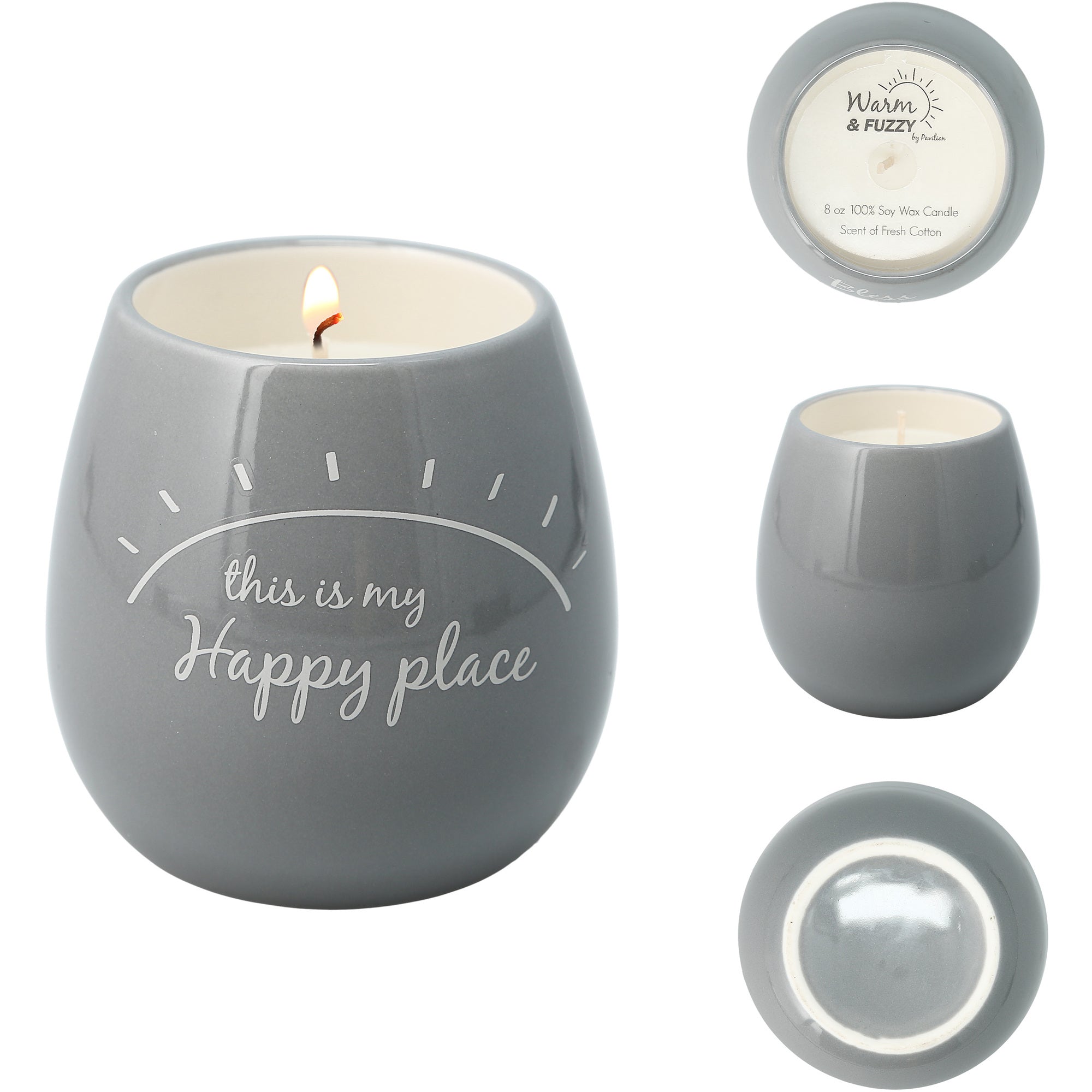 - IN-HOUSE DESIGN: The double-sided blanket has a debossed white embroidered "this is my happy place" sentiment matched by a burst of sunshine pattern on the gray plush side of the blanket. The aromatherapeutic candle has a white "this is my happy place" sentiment and sun design. Socks have a gray ankle, heel, and toe accompanied by a heart and swirl design on a white sock base.