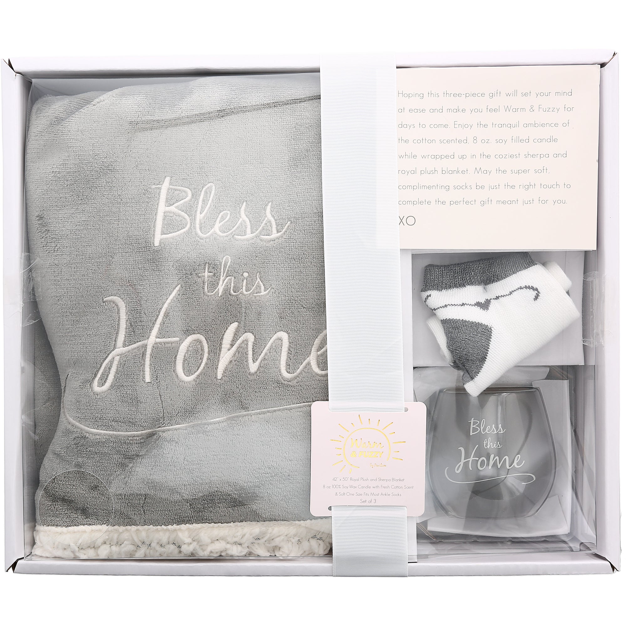 • IN-HOUSE DESIGN: The double-sided blanket has a debossed white embroidered "bless this home" sentiment matched by a scroll pattern on the gray plush side of the blanket. The aromatherapeutic candle has a white "bless this home" sentiment and scroll design. Socks have a gray ankle, heel, and toe accompanied by a heart and swirl design on a white sock base.