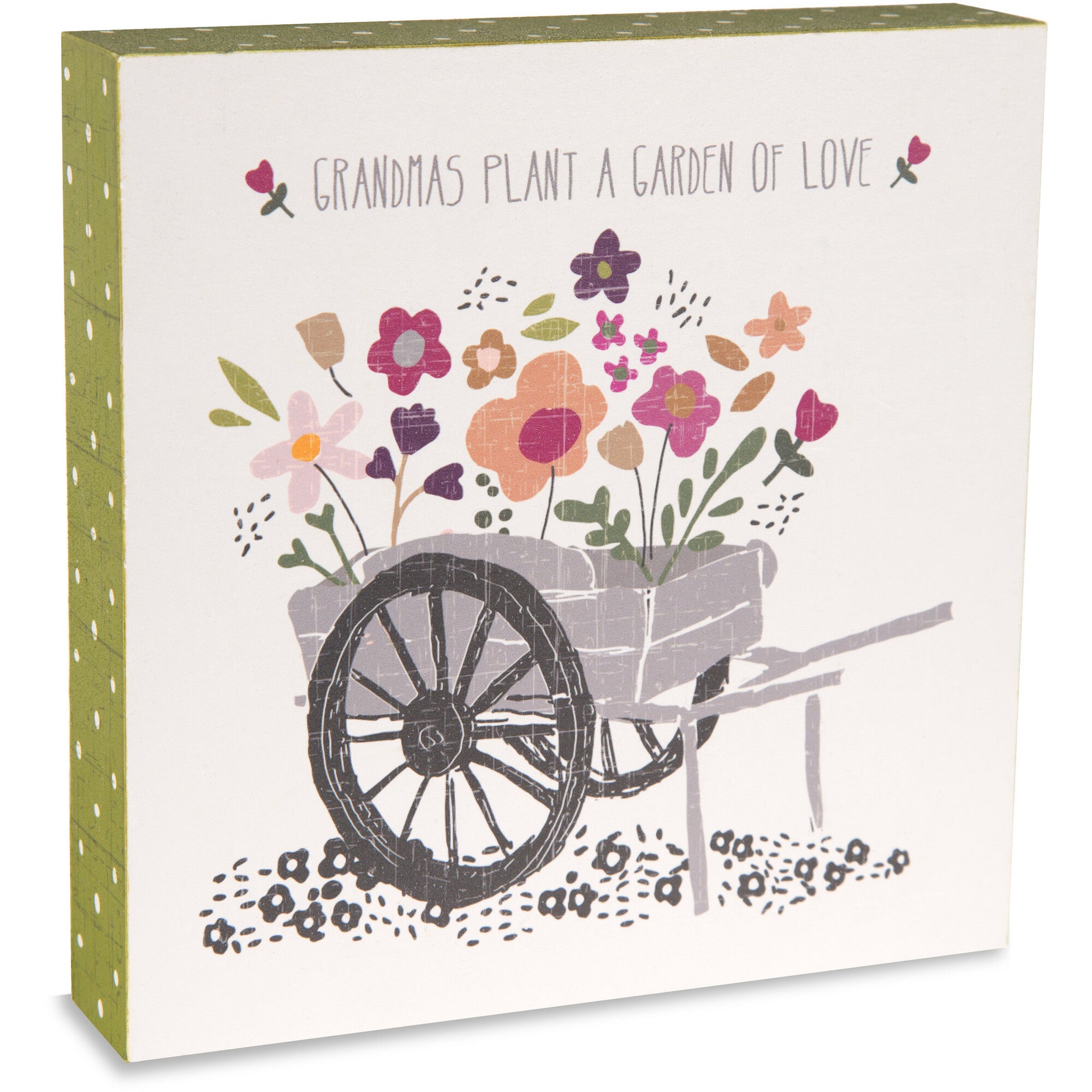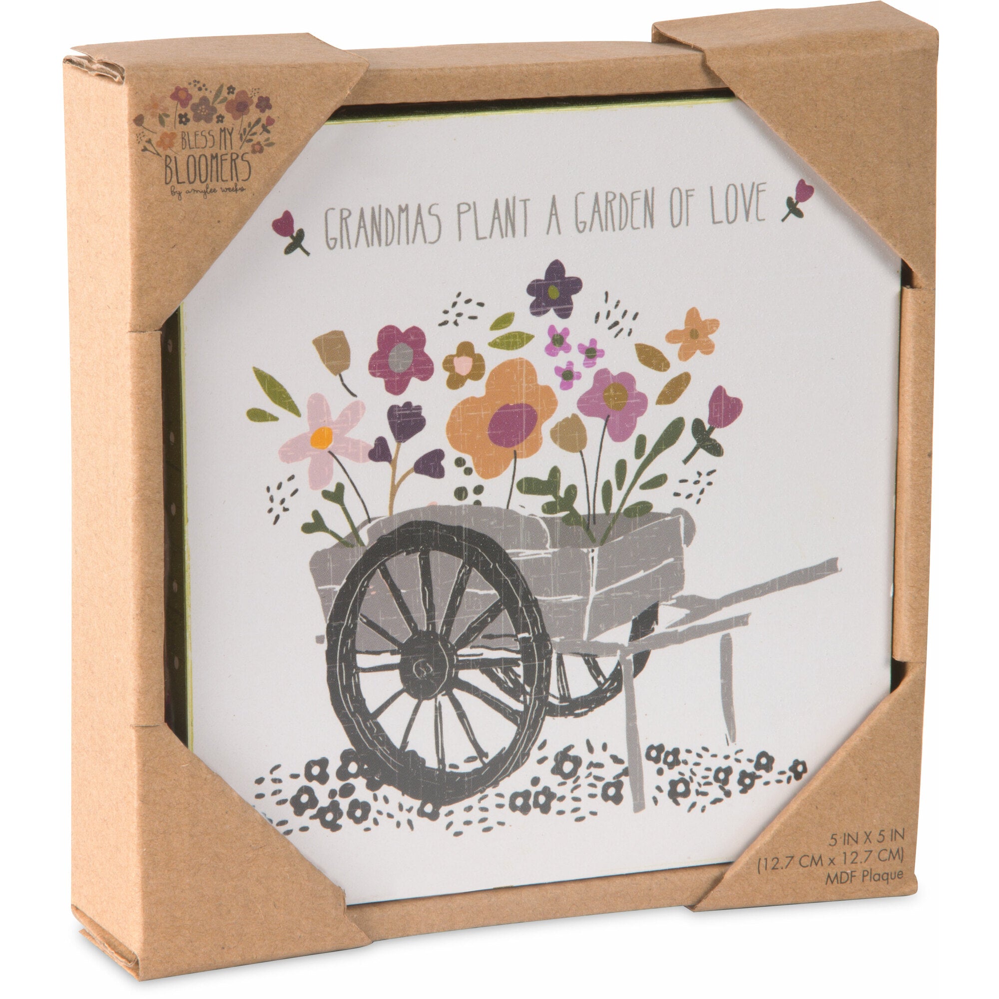 - IN-HOUSE DESIGN: Designed by Amylee Weeks, "Grandmas Plant A Garden Of Love" text is printed onto the front of the plaque and is accompanied by a wheelbarrow icon.