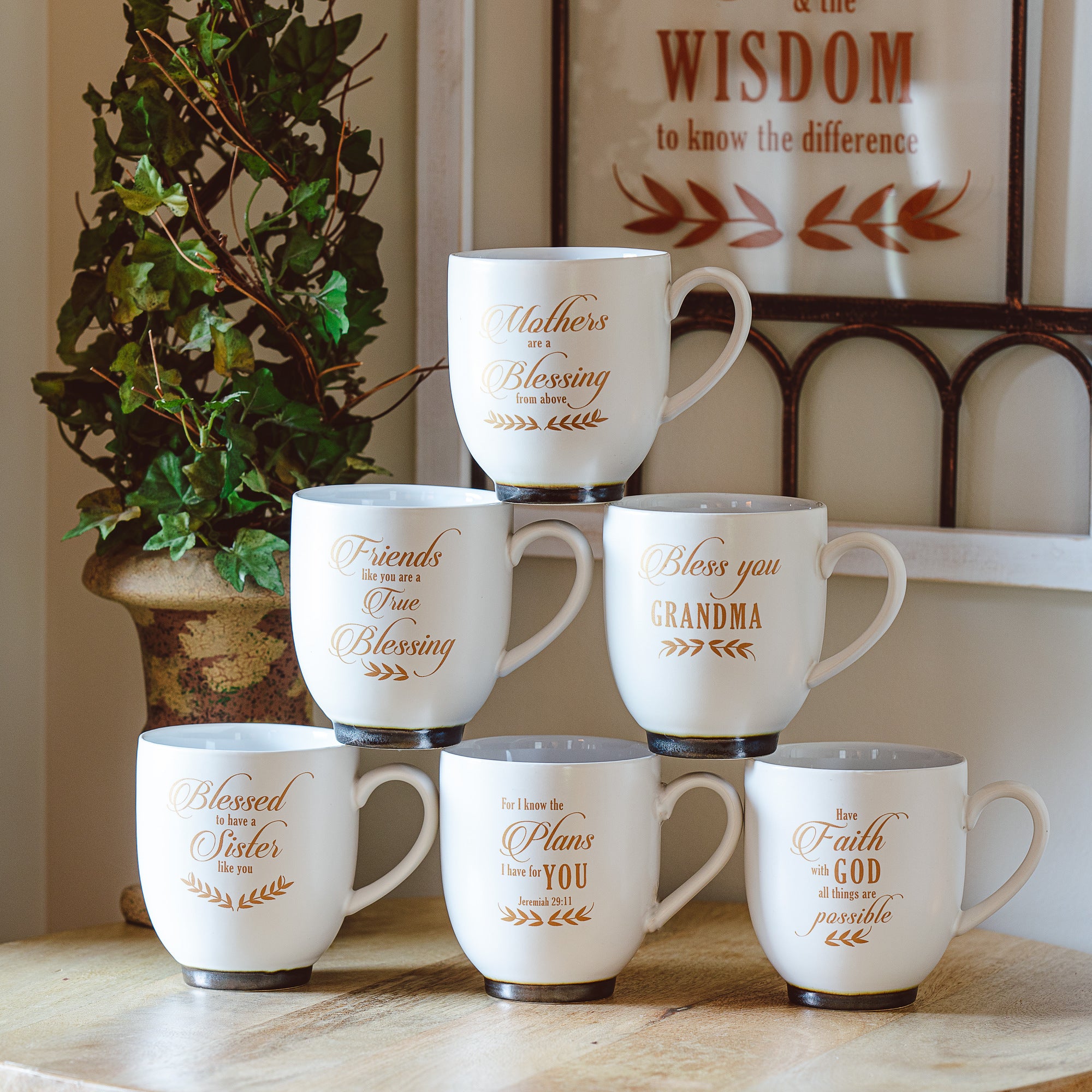 - IN-HOUSE DESIGN: "For I Know The Plans I Have For You - Jeremiah 29:11" text and accompanying leaf icon decals are applied to the front of the mug.
