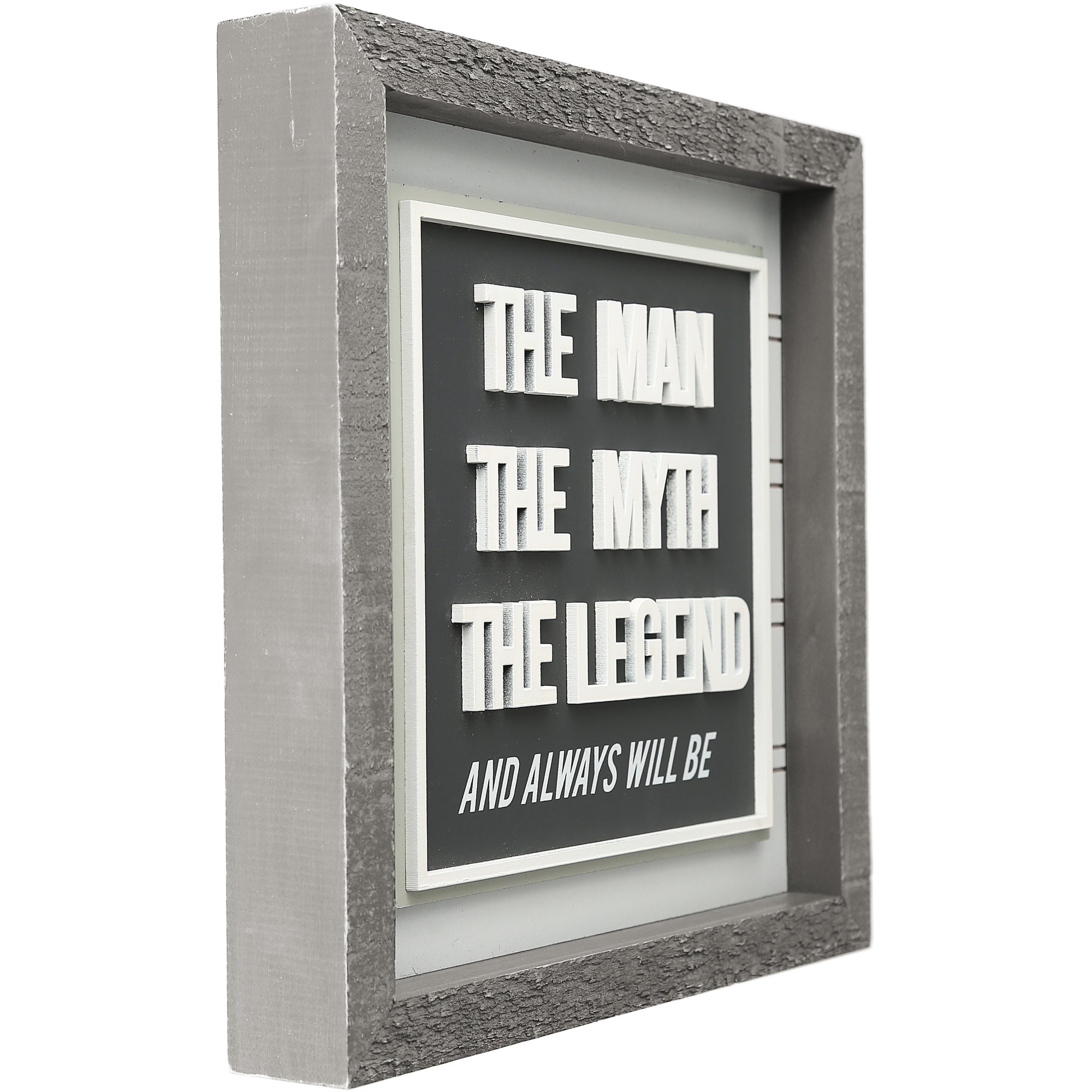 • IN-HOUSE DESIGN: Whitewashed gray pine rustic-style edges accompany a white shiplap backdrop, a raised dark gray box, and white edging. “The May The Myth The Legend” sentiment is 3-D, whereas the “And Always Will Be” text is printed onto the raised gray center.
