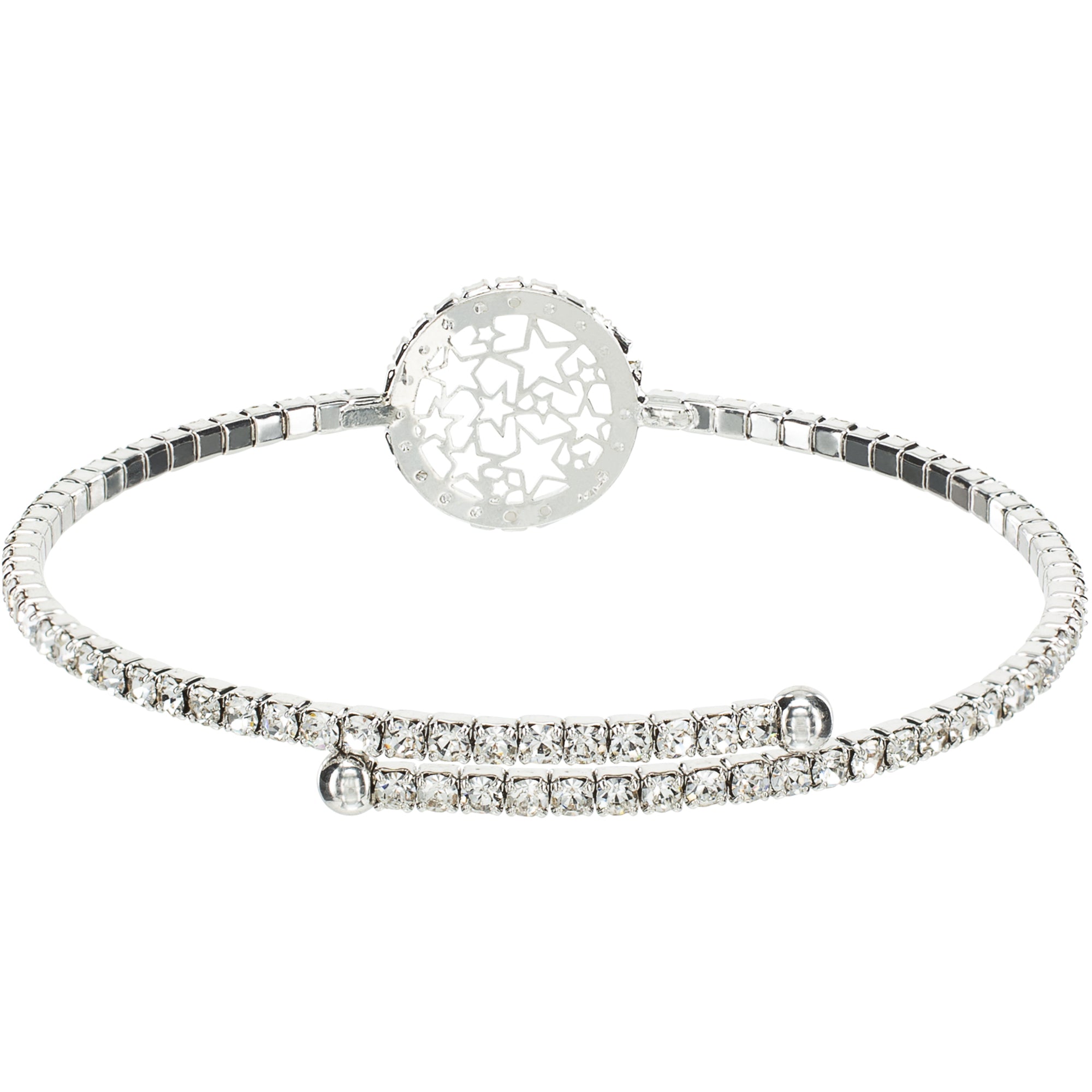 - PREMIUM QUALITY: Open bangle bracelet, packaged in a printed open-faced box, is made from rhodium-colored brass and crystal gems.