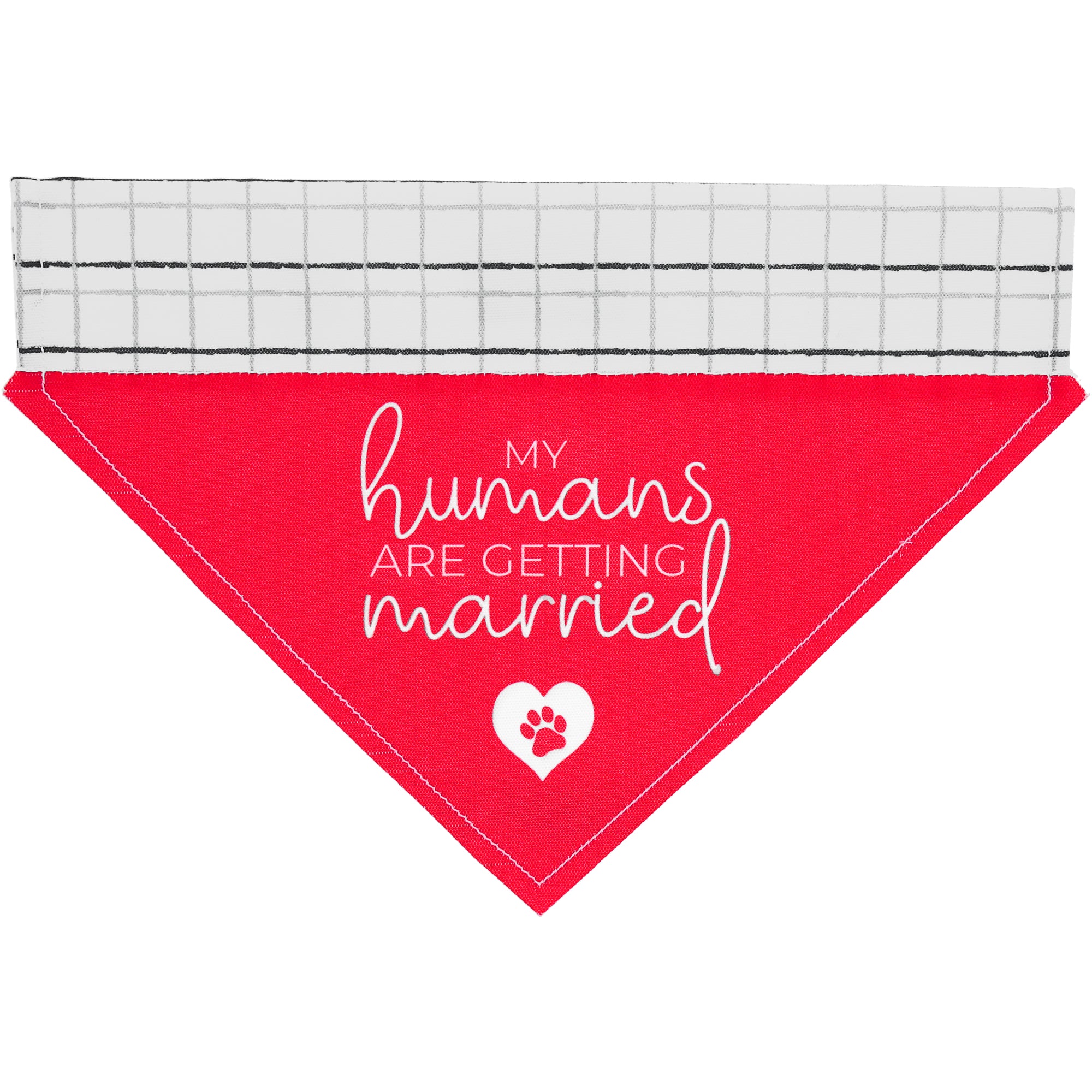 • IN-HOUSE DESIGN: The white background features a light and dark gray plaid checkered design on the over-the-collar part. The bottom red section has a "My Humans Are Getting Married" white sentiment with a pawprinted heart. The backside has a sewn-in logo tag on the striped section and a soft touch finish for comfort finish on the bottom triangle part.