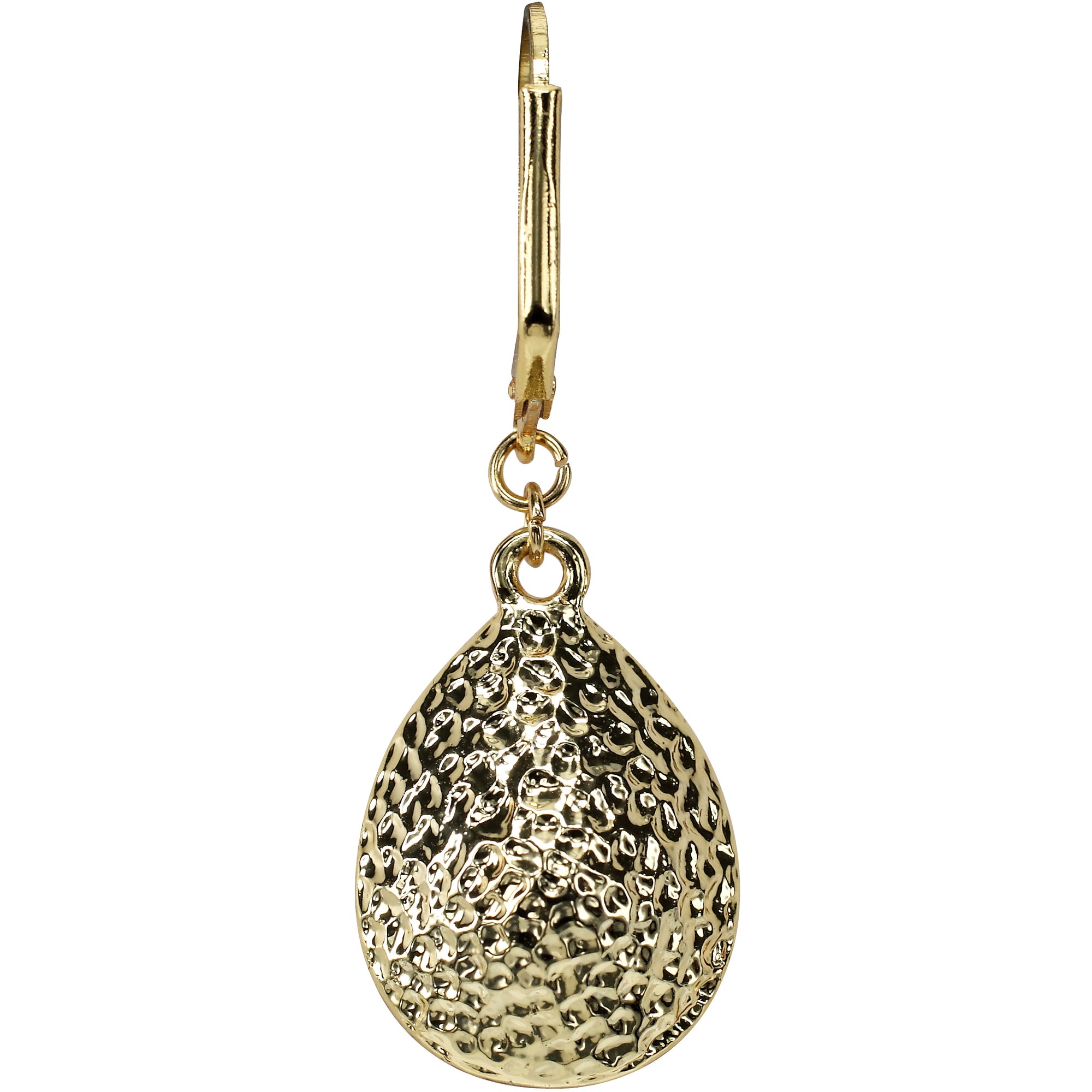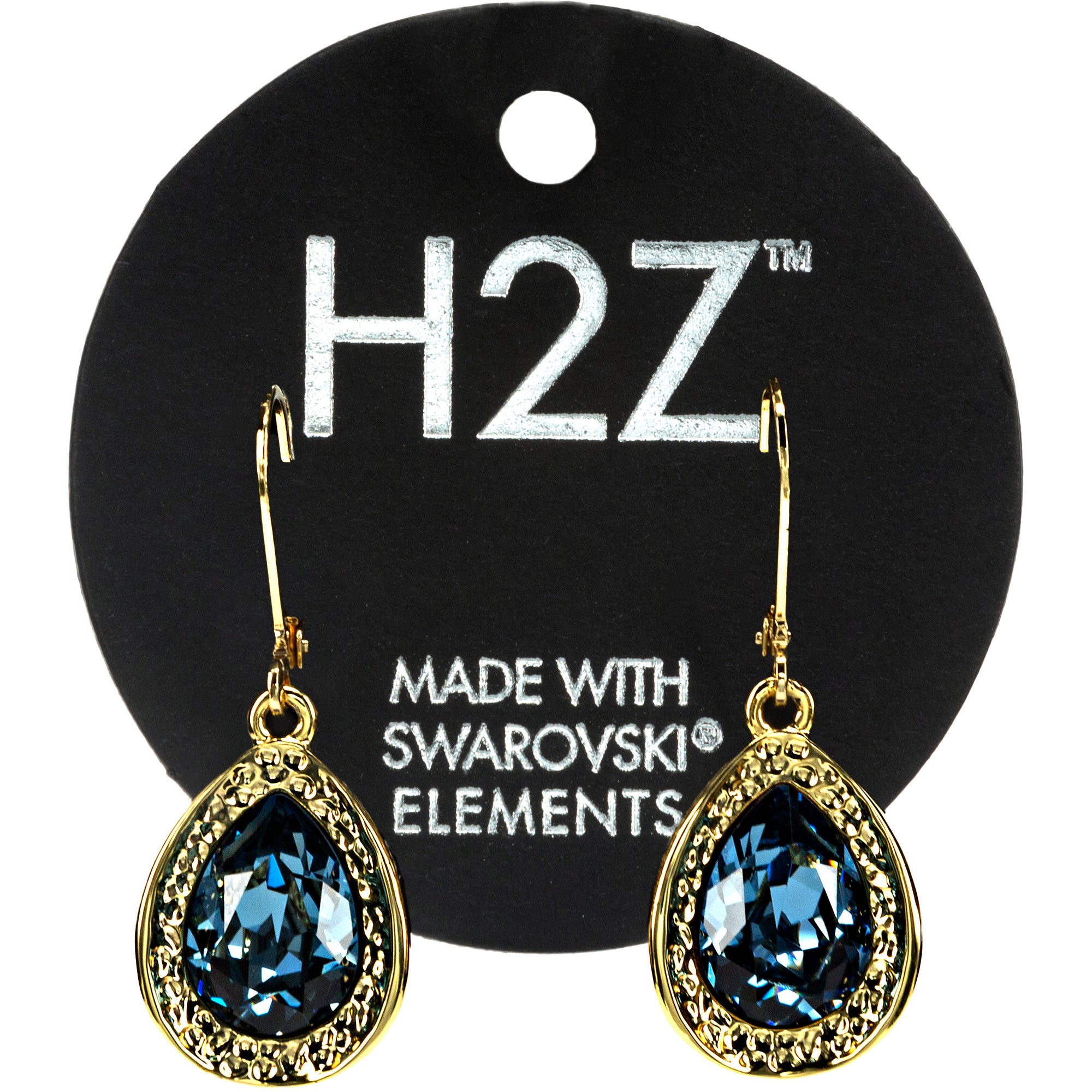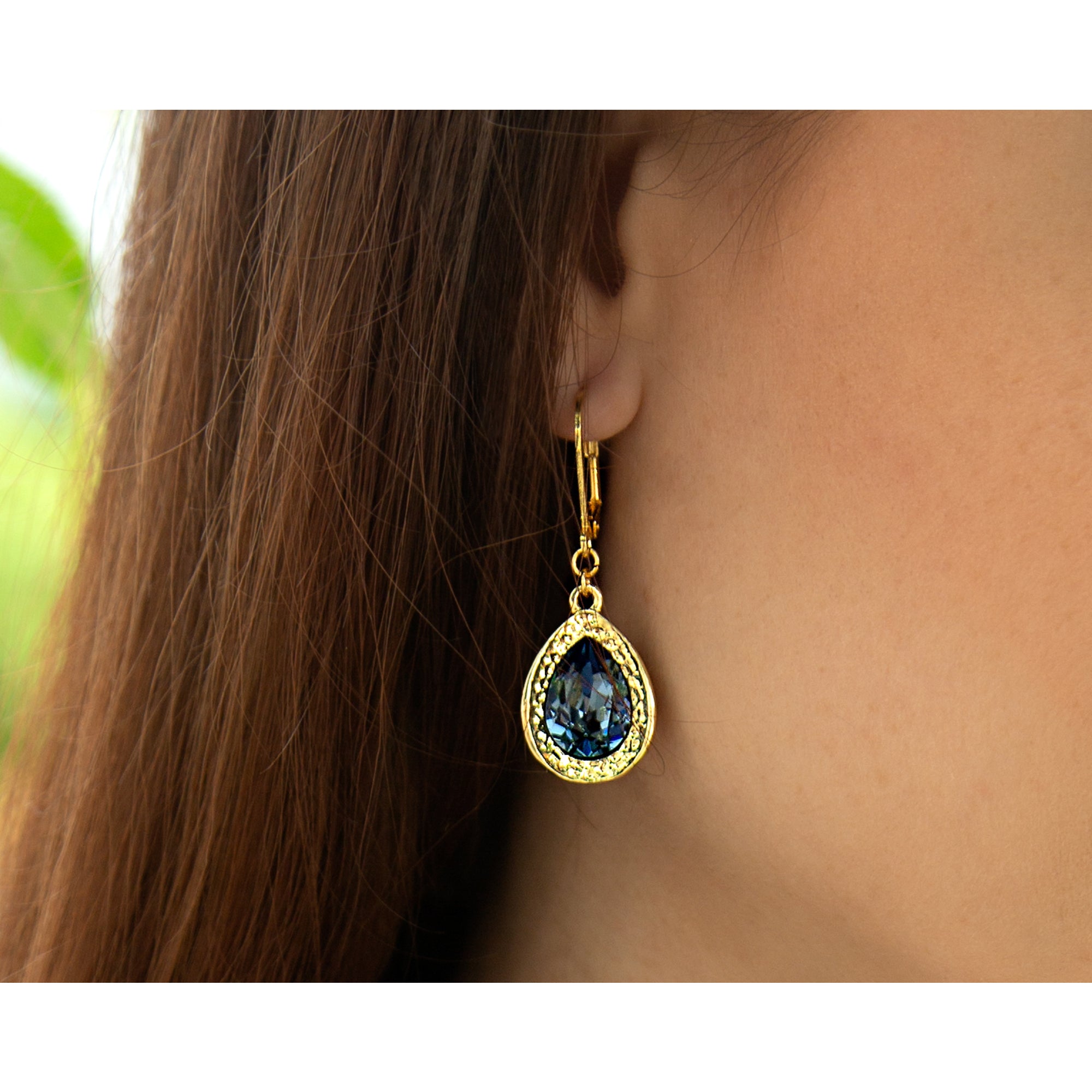 • IN-HOUSE DESIGN: Each earring features a hammered look teardrop-shaped gold detailing with a teardrop blue denim crystal.