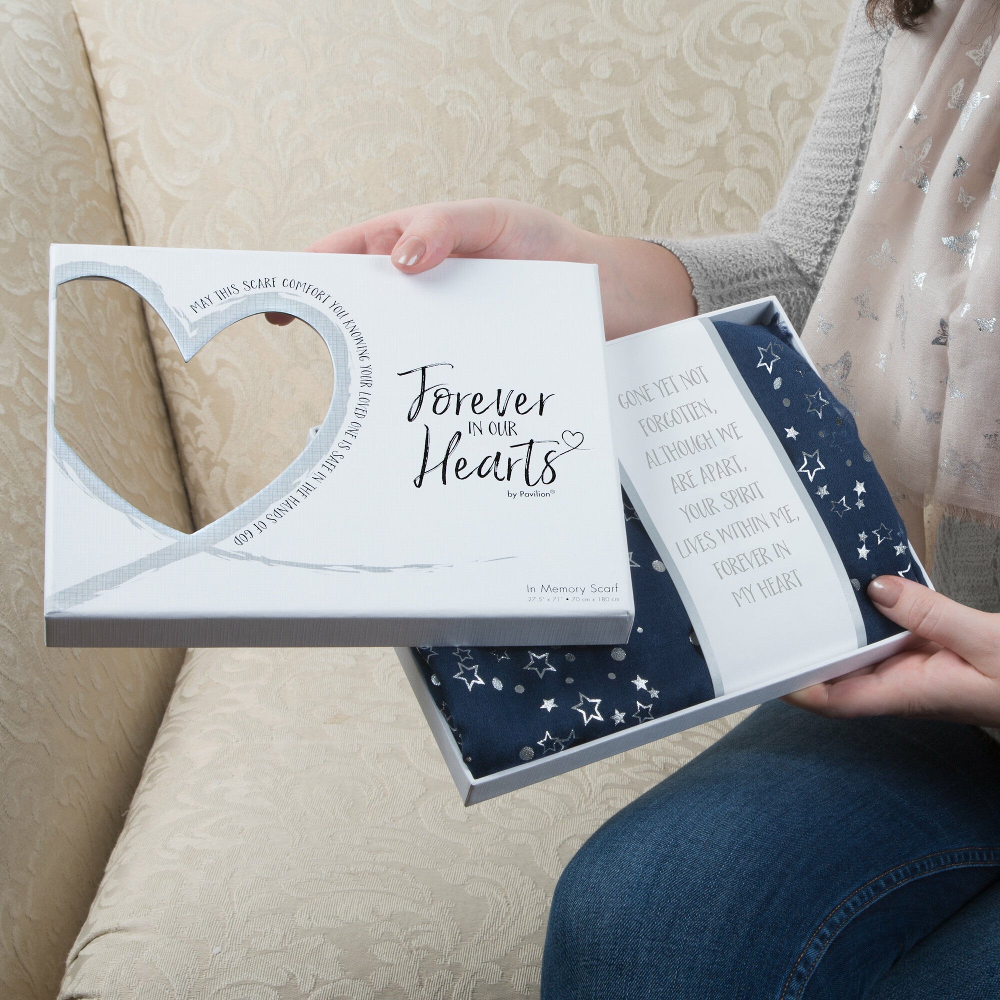- IN-HOUSE DESIGN: "Gone Yet Not Forgotten, Although We Are Apart, Your Spirit Lives Within Me, Forever In My Heart" text is printed on interior sleeve and is accompanied by printed stars on scarf and a sewn-in tag reading "Always & Forever In Our Hearts".