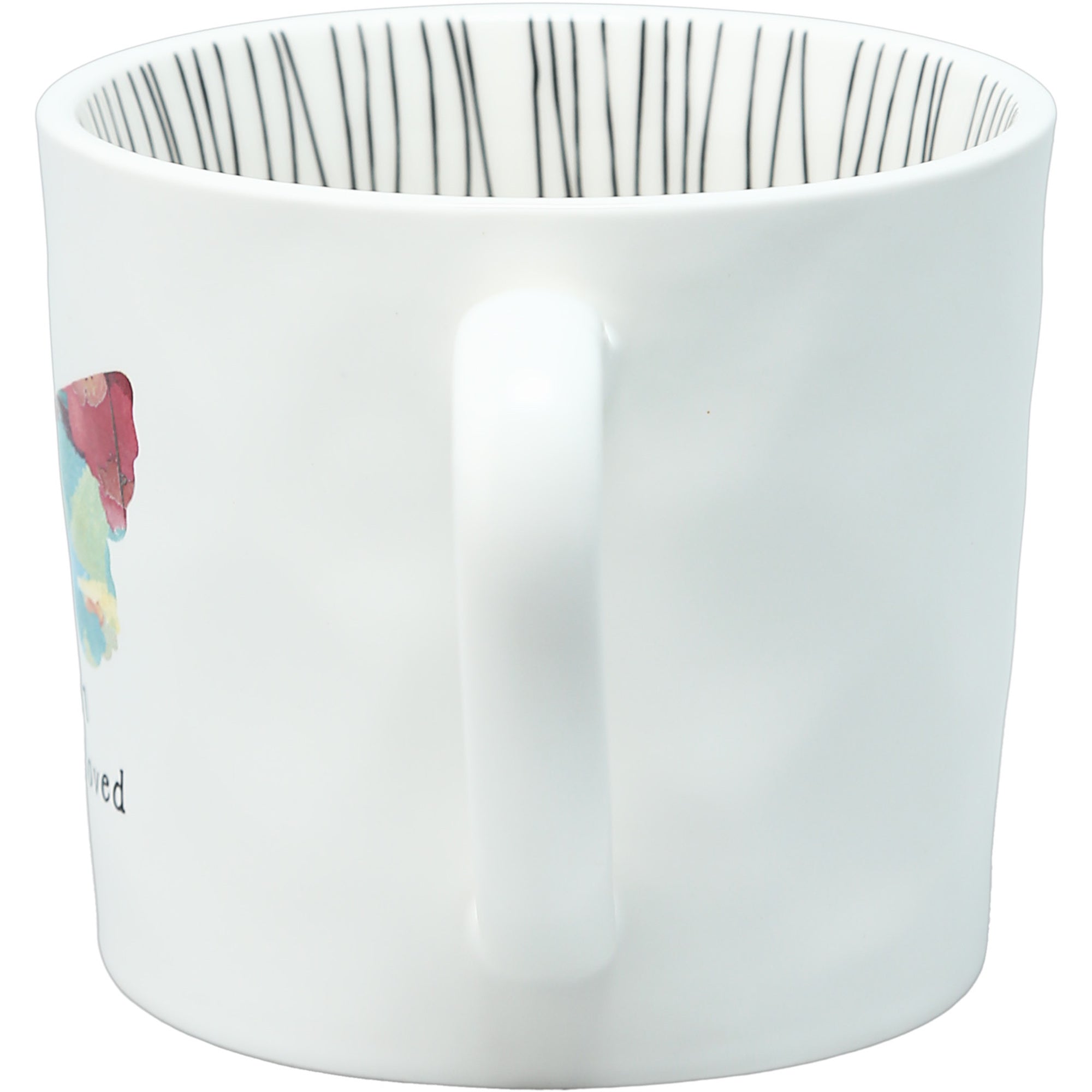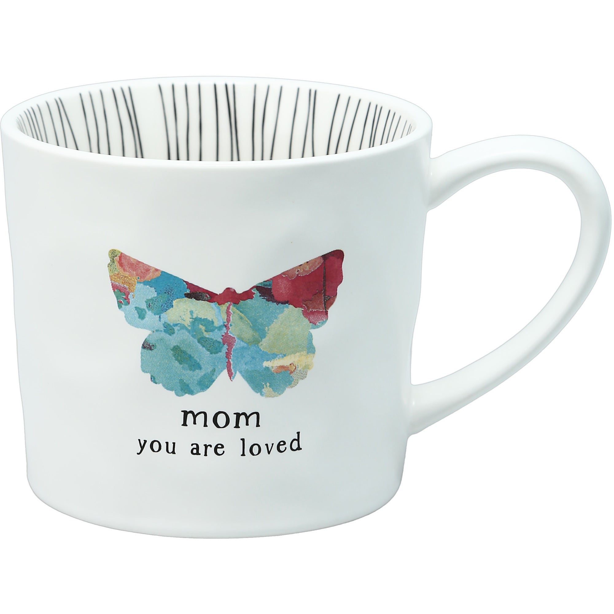- IN-HOUSE DESIGN: "Mom You Are So Loved" text and debossed color splash butterfly detail are applied to the exterior of the mug, while the interior features a stripe pattern.
