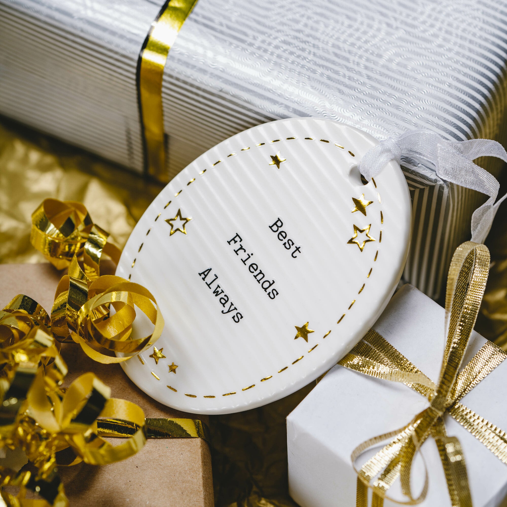 • IN-HOUSE DESIGN: "Best Friends Always" text and accompanying design are printed onto the front of the ornament.