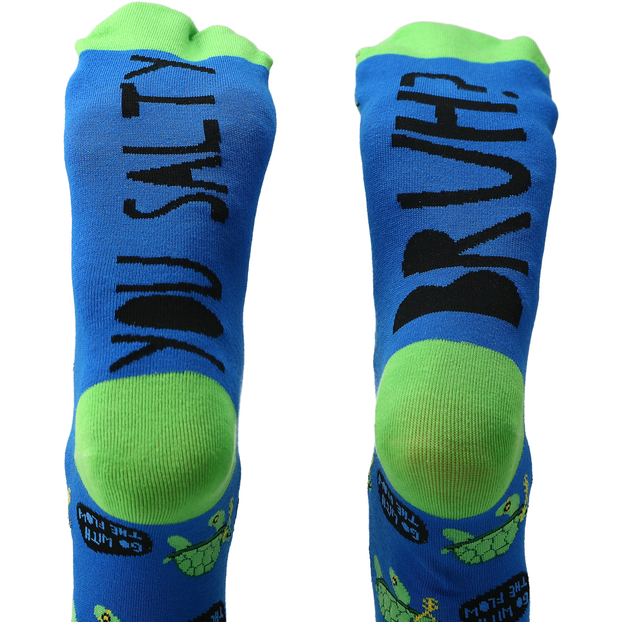 • IN-HOUSE DESIGN: Green ankle, heel, and toes are attached to an overall blue body. The turtle characters wear black sunglasses, a gold money sign necklace, and a gold watch—repetitive black speech bubbles with "GO WITH THE FLOW" in blue font. One sock bottom has "YOU SALTY" sentiment while the opposite sock has "BRUH?" sentiment in black.