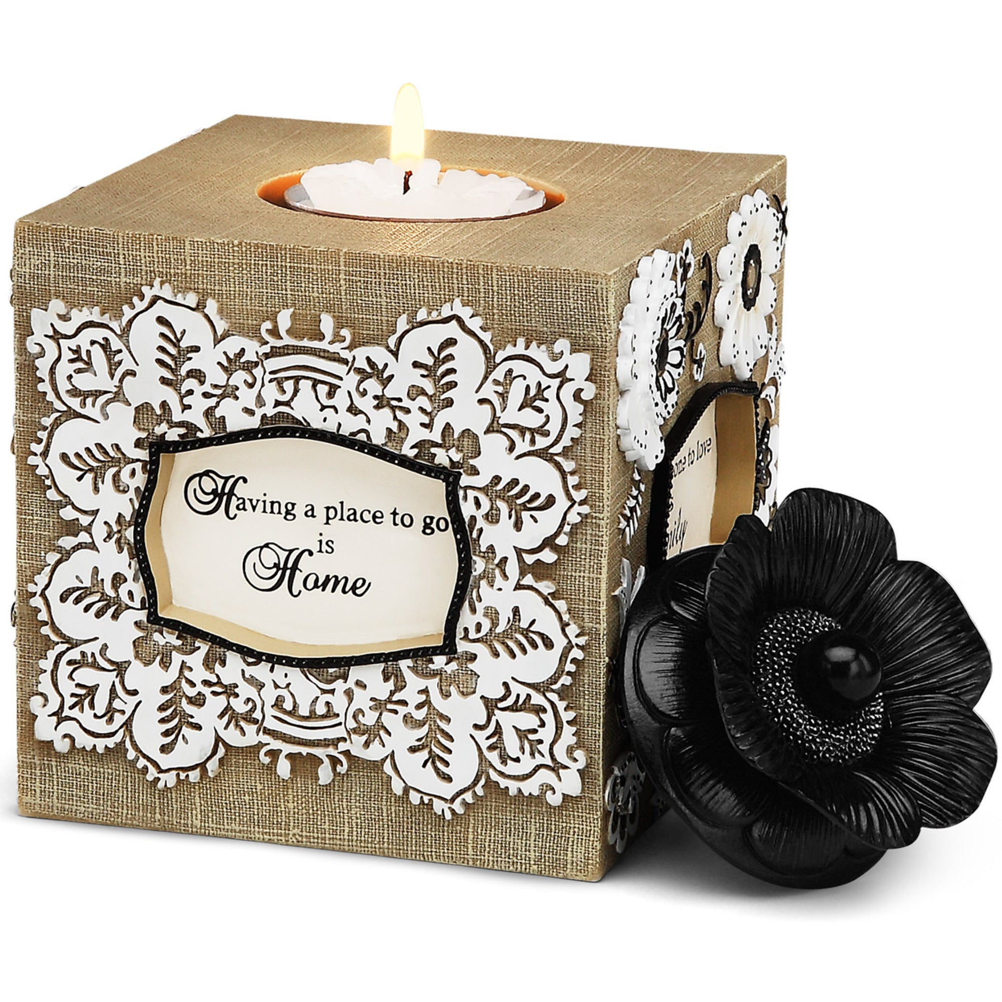 - IN-HOUSE DESIGN: "Having A Place To Go Is Home; Having Someone To Love Is Family; Sharing Good Times With Those Who Care Is Friendship; Having Them All Is A Blessing" text and accompanying floral design are both printed onto the sides of the candle holder.