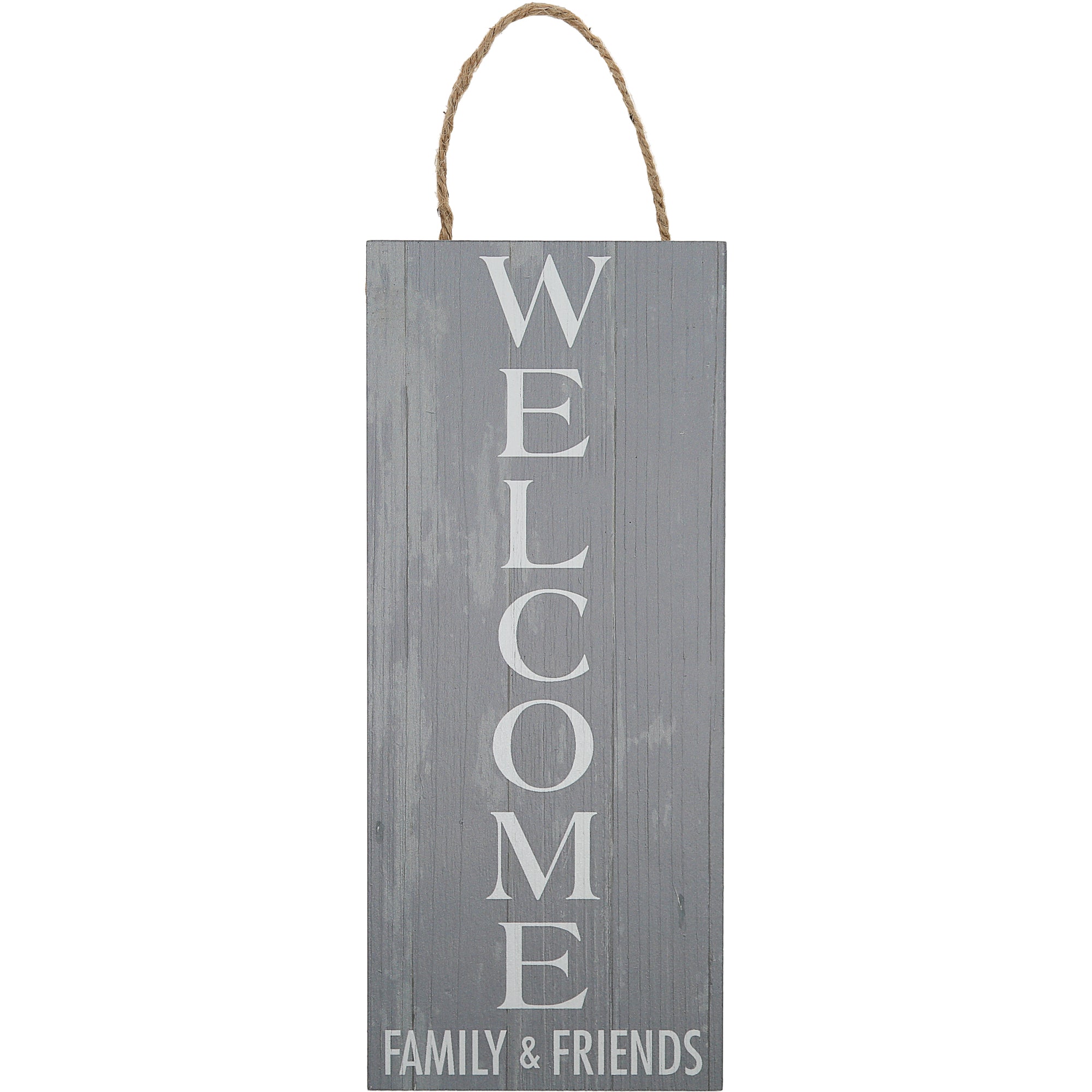 - IN-HOUSE DESIGN: The cool gray rustic-finished textured four-section boarded front has a glossy gray "Welcome Family & Friends" sentiment decal. The flat-backing has a natural pine finish.