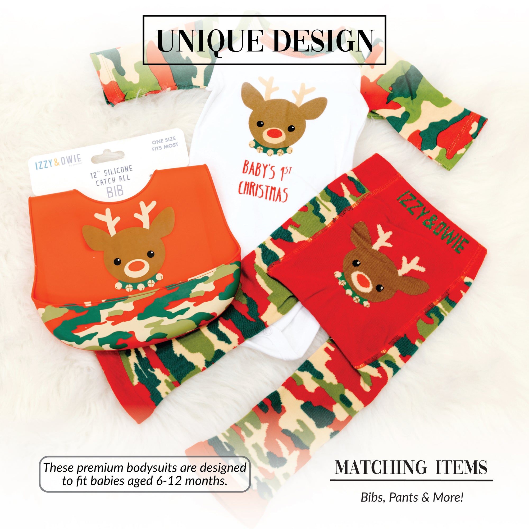 - IN-HOUSE DESIGN: The red, green, and tan camouflage pattern covers the sleeves and neckline, whereas the back has a solid white front and a buck/deer with tan antlers and snout, a red nose, jingle bell collar, along with a "Baby's 1st Christmas" sentiment underneath.