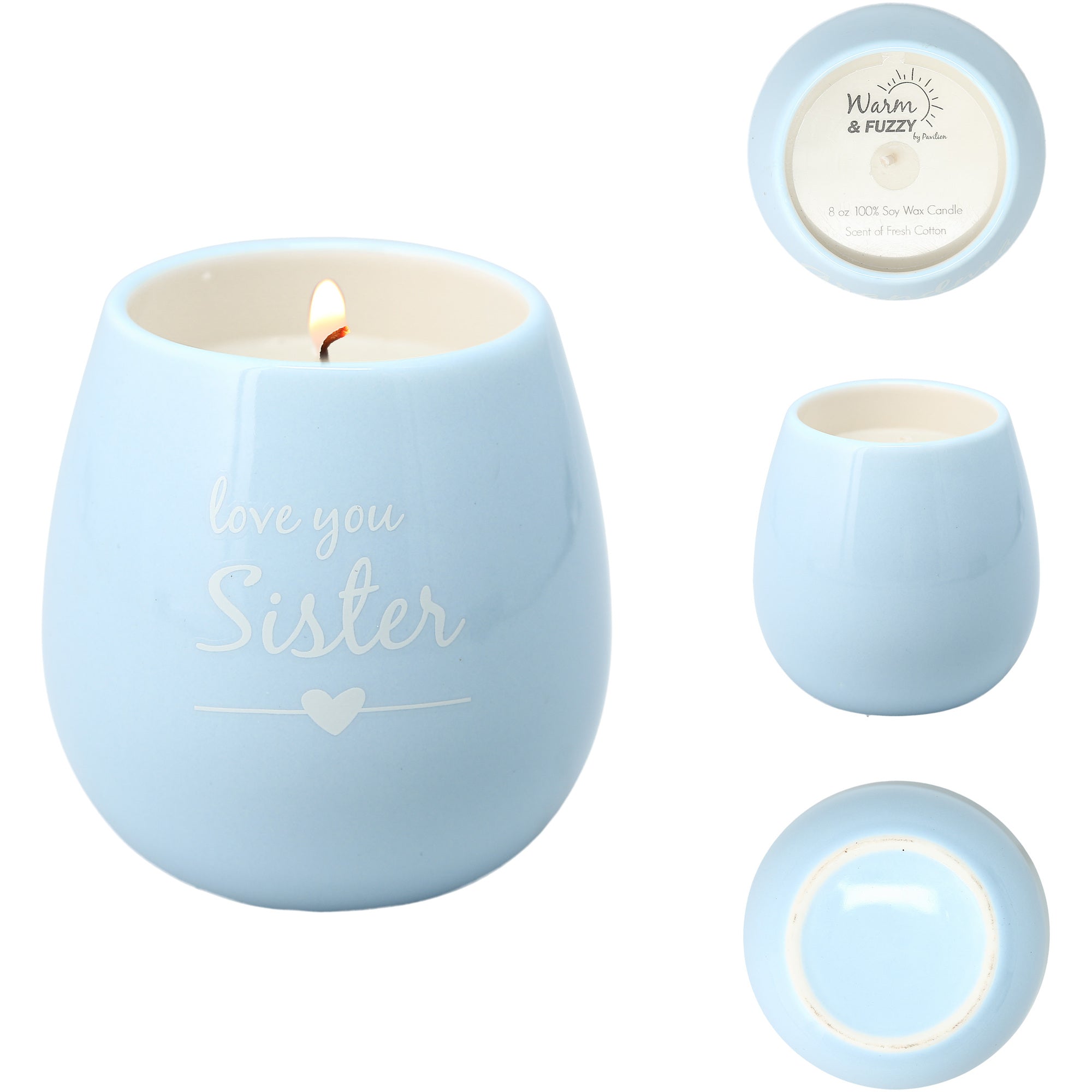 - IN-HOUSE DESIGN: The double-sided blanket has a debossed white embroidered "love you sister" sentiment matched by a heart pattern on the blue plush side of the blanket. The aromatherapeutic candle has a white "love you sister" sentiment and heart design. Socks have a gray ankle, heel, and toe accompanied by a heart and swirl design on a white sock base.