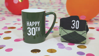 • IN-HOUSE DESIGN: "Happy 30th" white sentiment design is printed onto the front of the mug, while the socks feature sewn-in white "30" on the ankle, a green geometric plaid argyle pattern on a green background with dark green ankle, heel, and toe.