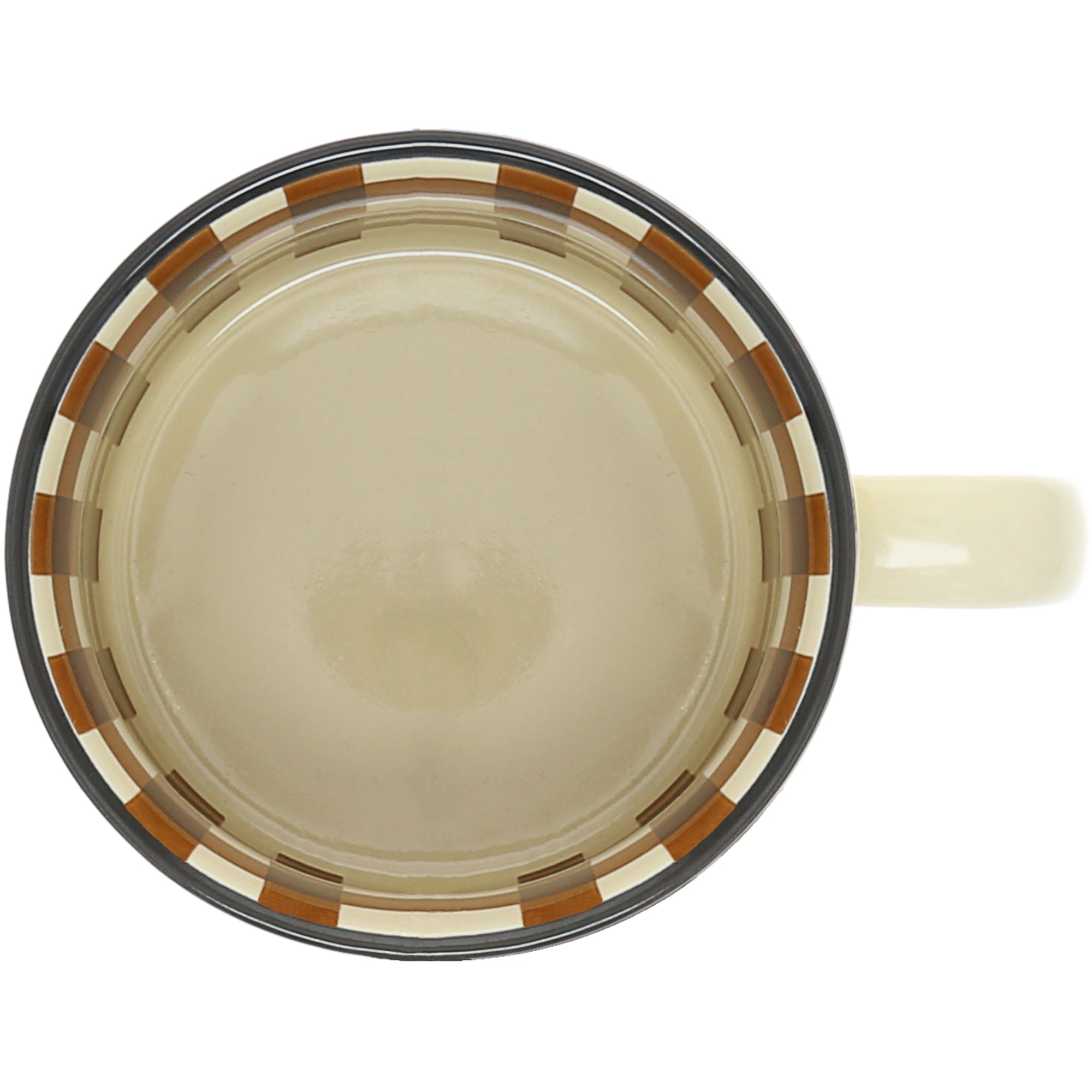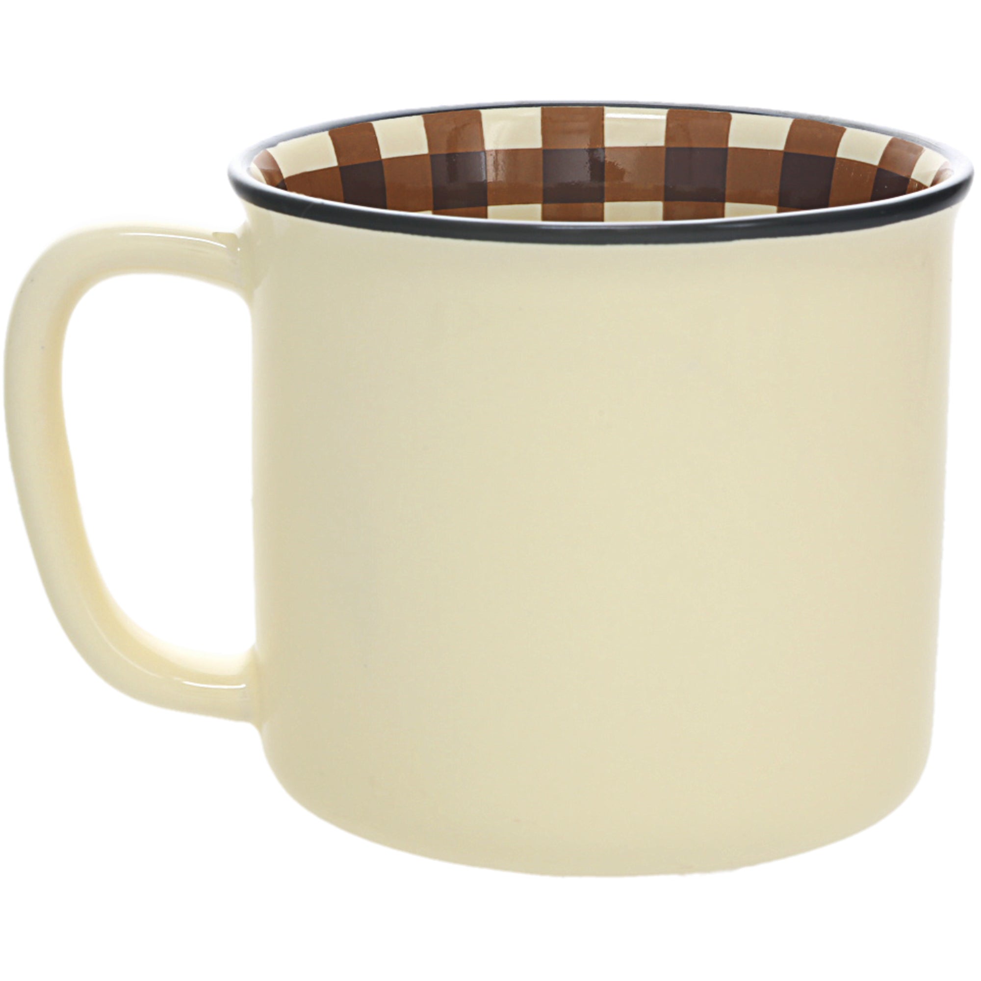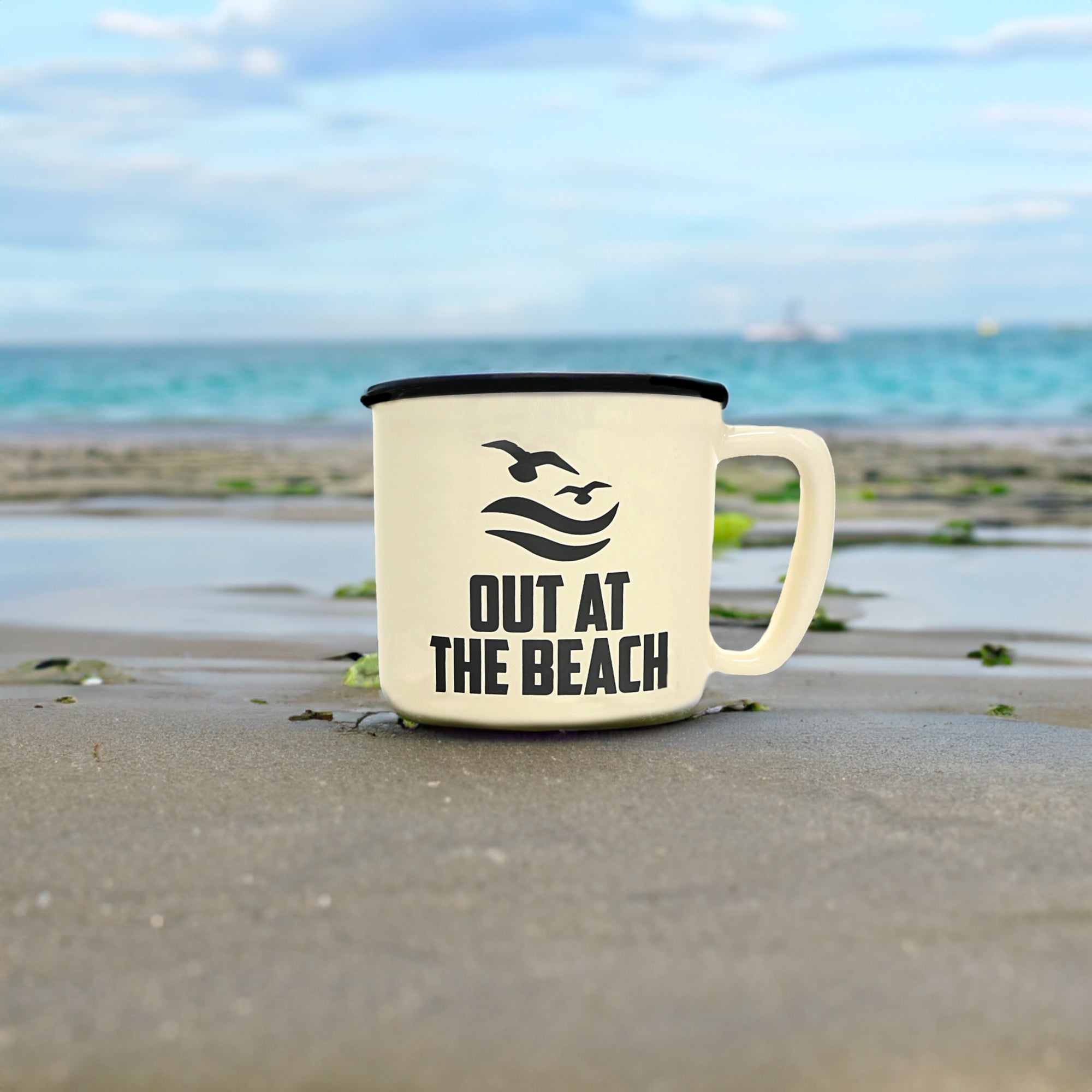 - IN-HOUSE DESIGN: The sandy tan exterior coffee cup features an "Out At The Beach" one-sided design accompanied by a black double seagull and sea wave decal. The interior features a brown plaid pattern that lines the vessel's walls.