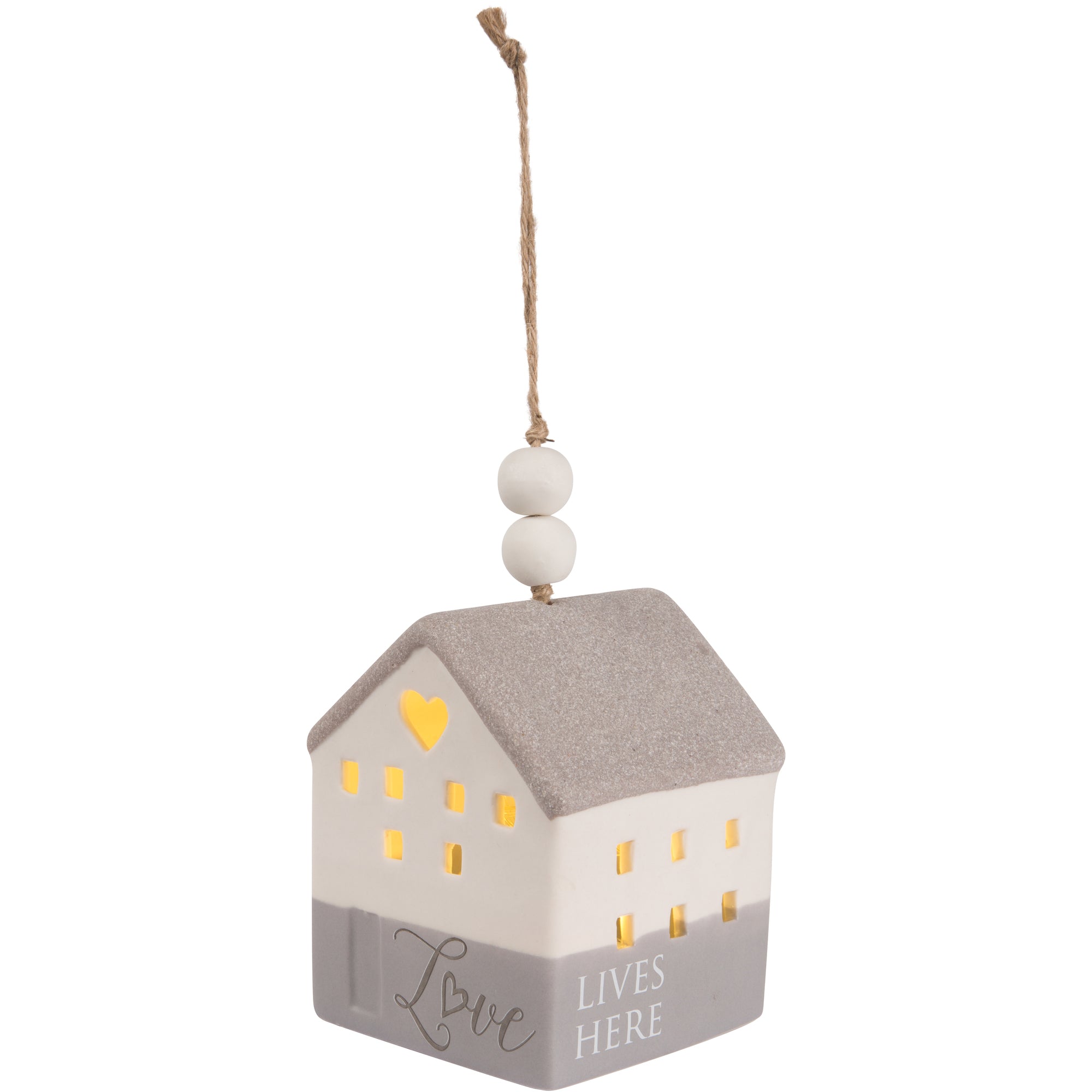 - PREMIUM QUALITY: LED house-shaped lantern, packaged in a printed box, is made from porcelain and features twine for hanging.