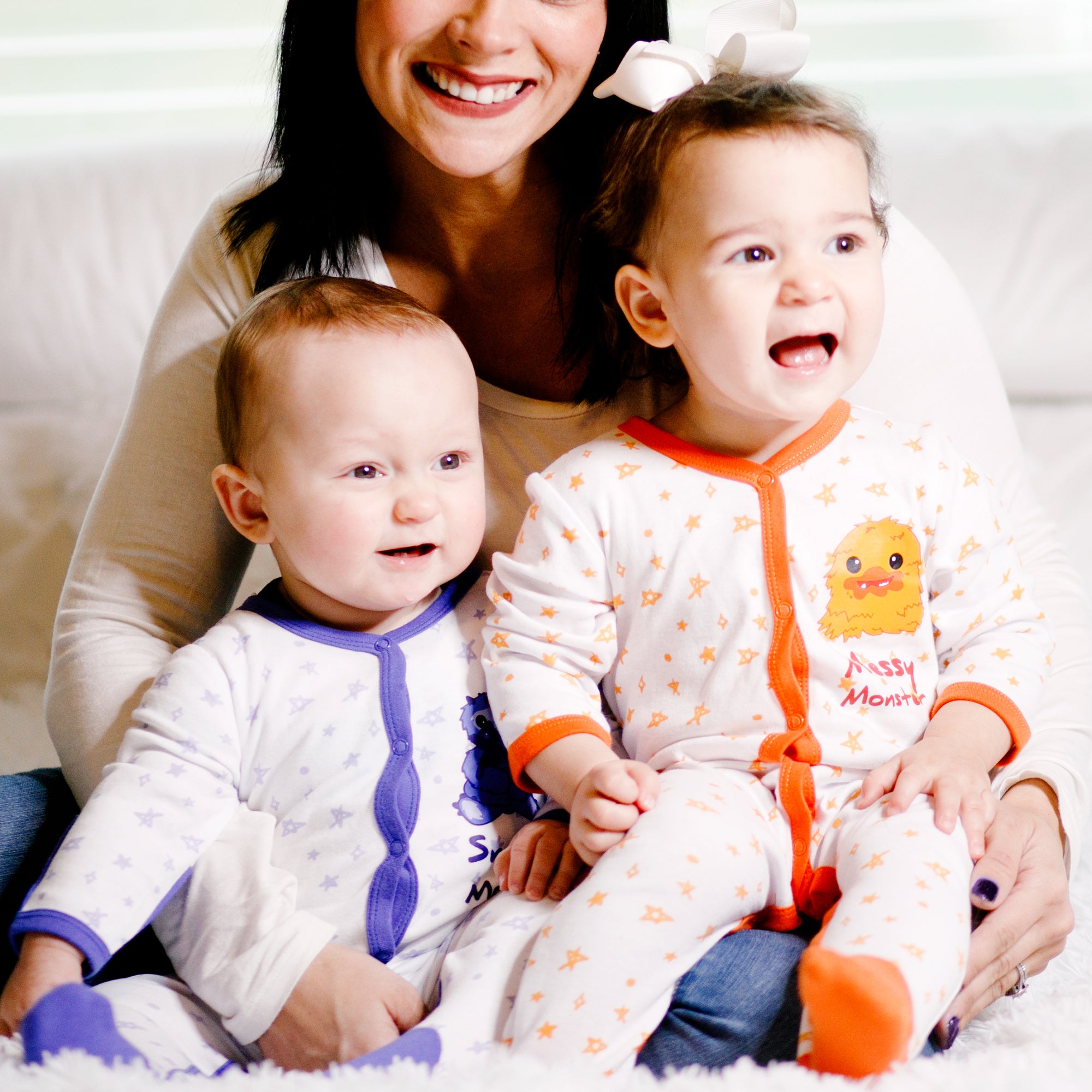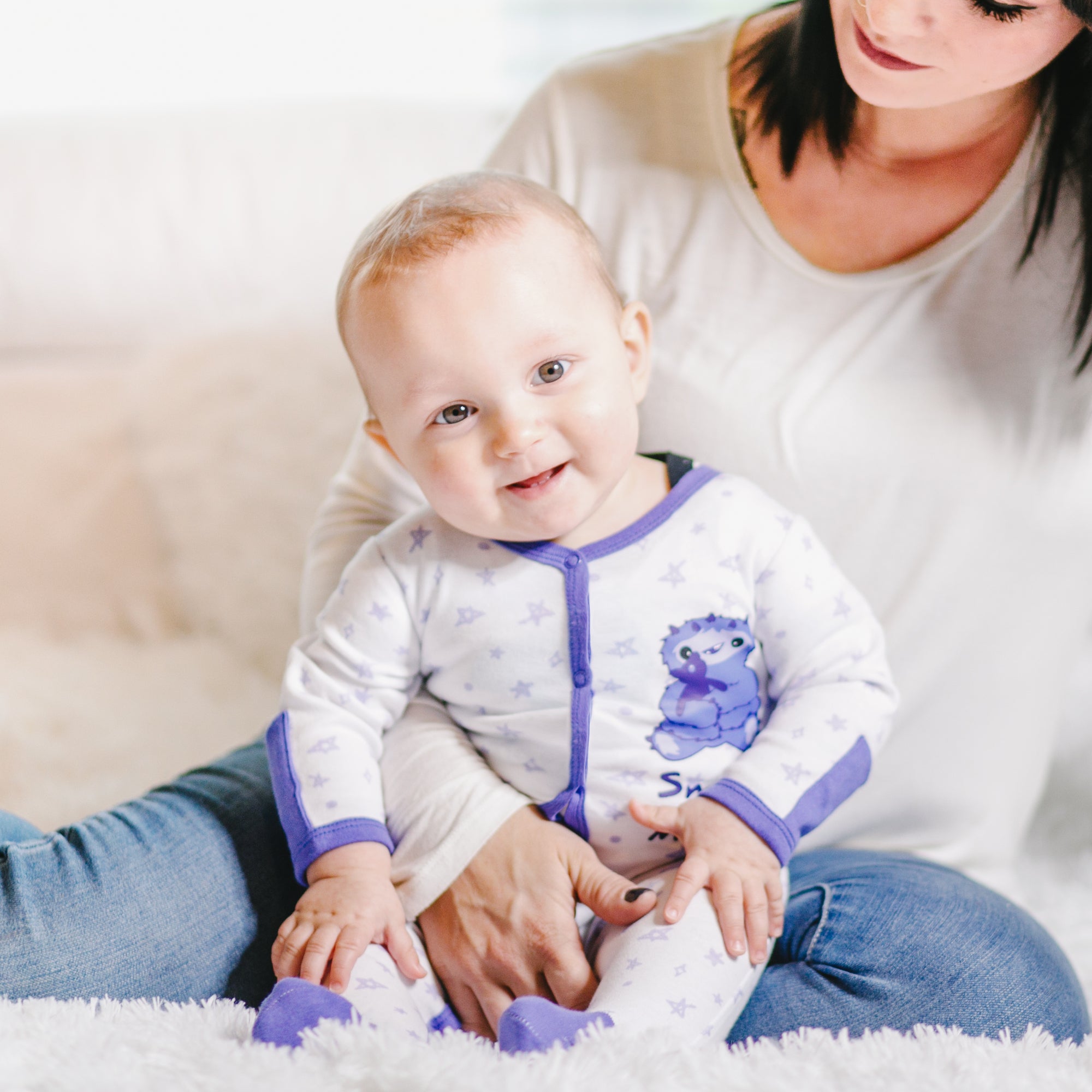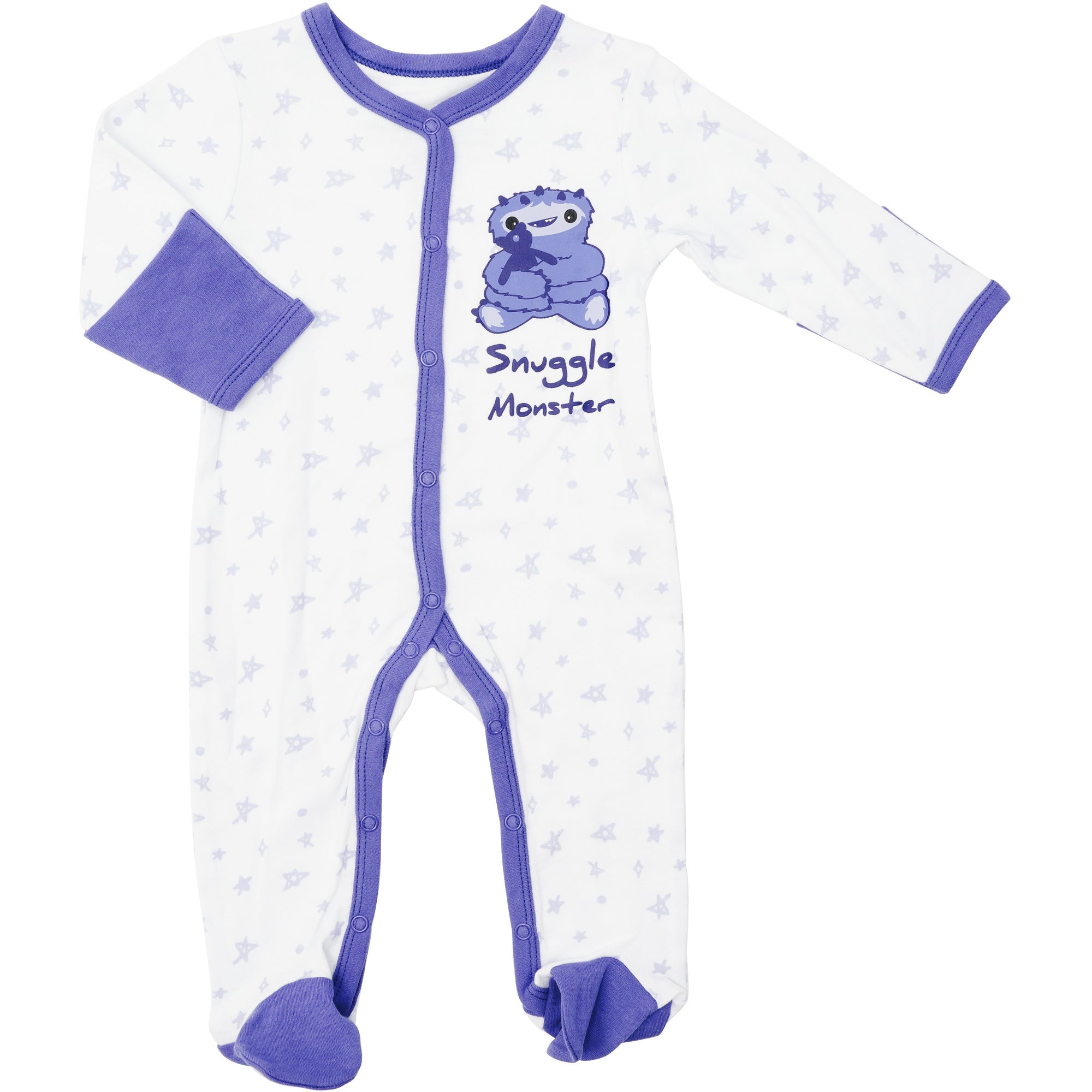 - IN-HOUSE DESIGN: Purple trimmed edges go around the neck, wrists, down the center, and the inside of the legs. Hand and feet covers are solid purple. The light purple messy hand-sketched star pattern covers the remainder of the exterior. The big fuzzy five-horned monster is snuggling his teddy bear and accompanied by "Snuggle Monster" screen-printed sentiment on the left chest area. Itch-free tagless sizing is printed on the interior collar.