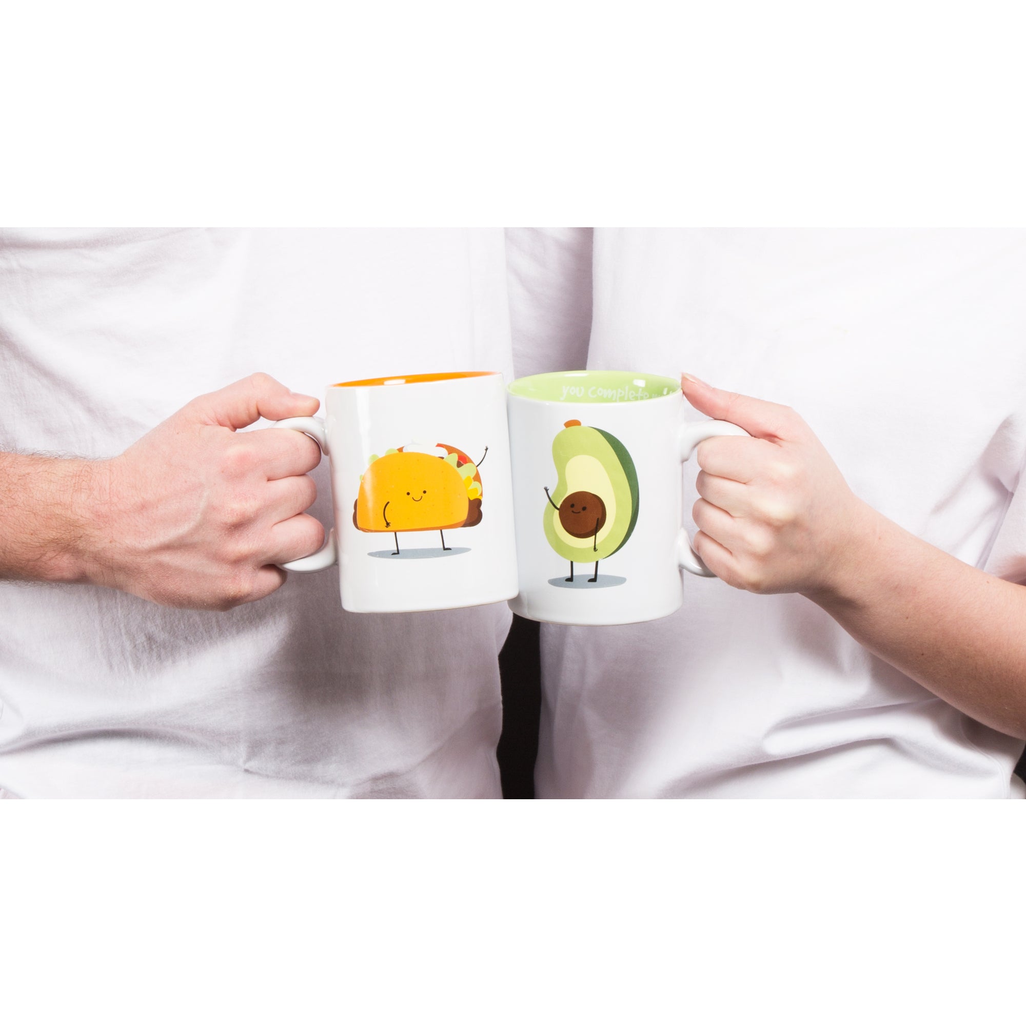 - IN-HOUSE DESIGN: "You Complete Me" text is printed on the inside of each mug with each mug complementing the other by featuring a taco or an avocado character on the front and the bottom of the inside.