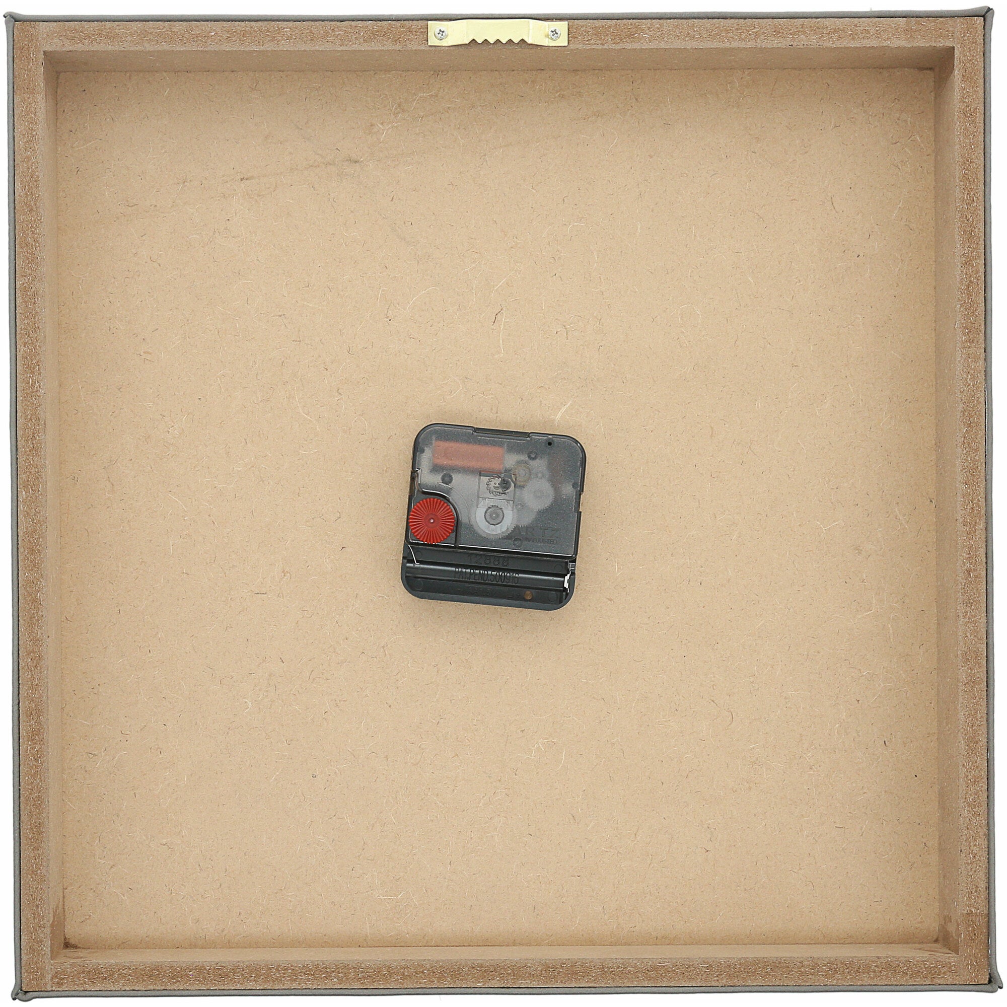 - PREMIUM QUALITY: 12.25" square x 2" thick PU leather wrapped around an MDF frame with gray stitching. Thin metal matte brushed silver arms are connected to the back plastic holder, which requires an AA battery (not included) and has a rotating wheel to change the clock's time. The gold sawtooth is for wall hanging.