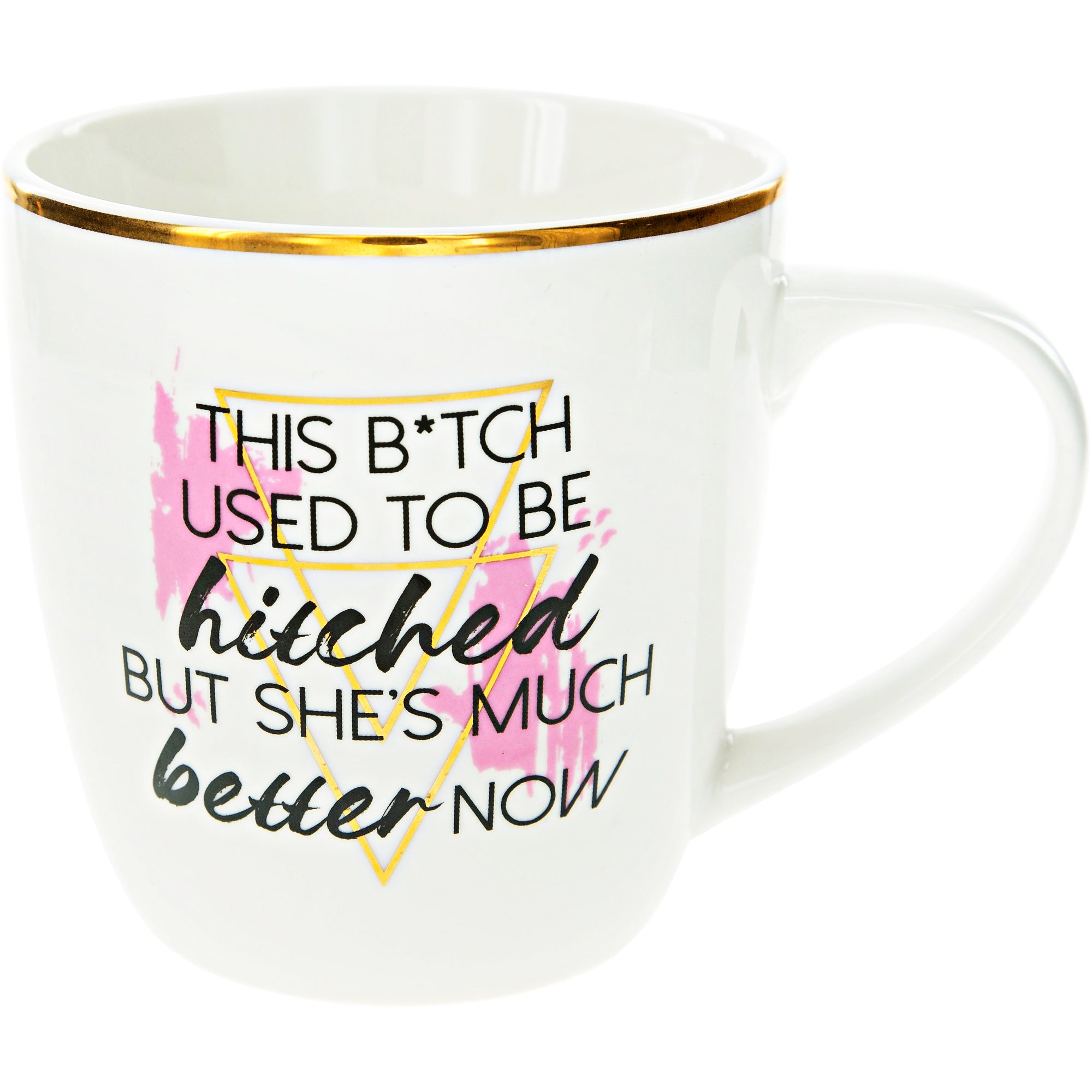 - IN-HOUSE DESIGN: "This B*tch Used To Be Hitched But She's Much Better Now" text and accompanying decal are both printed onto the mug.