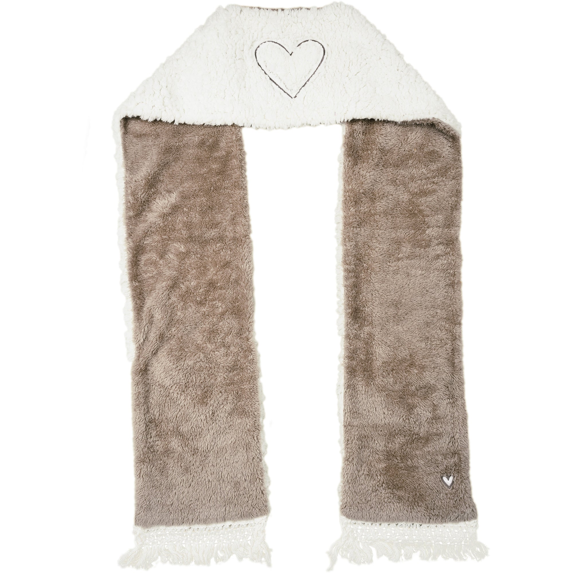 • PREMIUM QUALITY: The white side of the scarf is made from 100% polyester sherpa. The brown side of the scarf is made from 100% polyester fleece. At the neck of the scarf, there is a satin heart. There is a small satin heart on each reversible side near one of the pockets as well. The pockets are made from a linen material. The fringed ends are made from polyester.