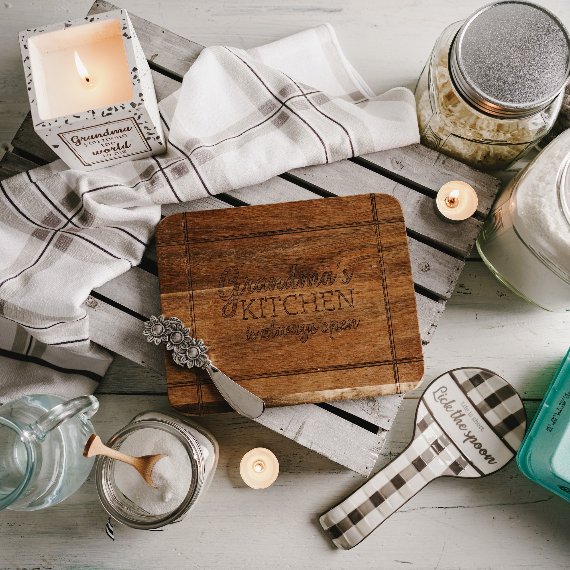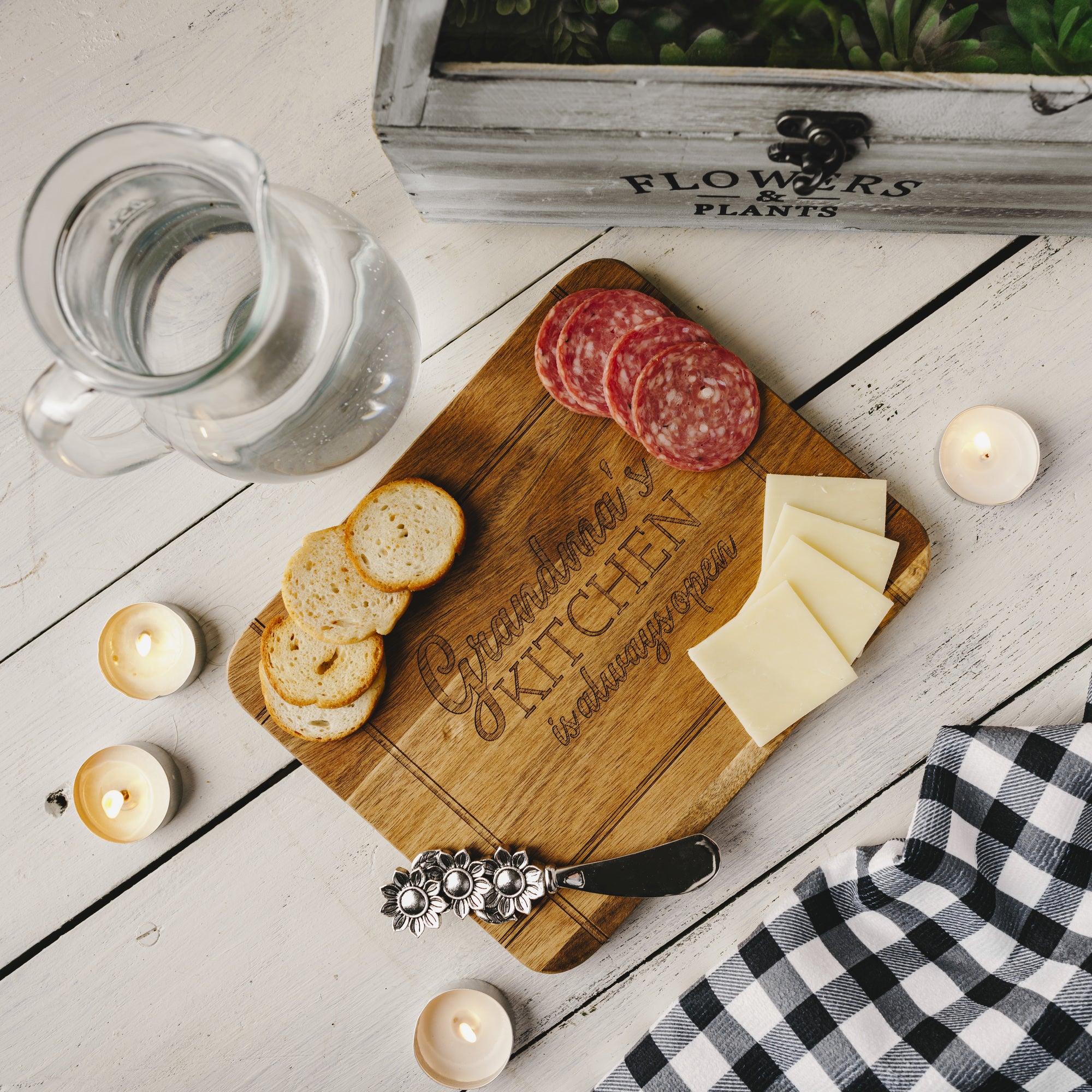 • IN-HOUSE DESIGN: Each woodblock has a different grain pattern from light, medium and dark toned woods making each product unique. The "Grandma's Kitchen Is Always Open" sentiment and bordered plaid pattern are laser engraved onto the front of the board. The back of the board is plain and could be used as a cutting board while the front side is perfect for serving household guests.