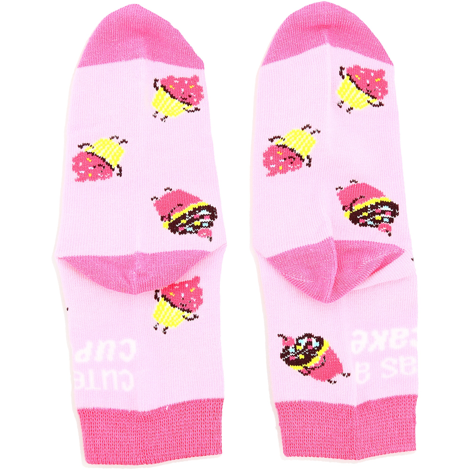 - IN-HOUSE DESIGN: Features a sewn-in cupcakes pattern on the pink top and side parts of the sock. The outer ankles feature “Cute as a Cupcake” text that is also sewn in. The toes, heels and tops are a solid darker pink color. Socks come packaged inside of a plastic poly bag with a hangtag and ribbon.
