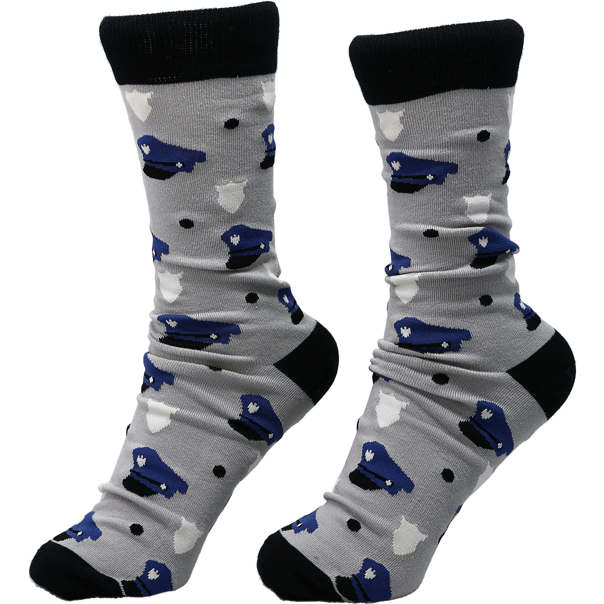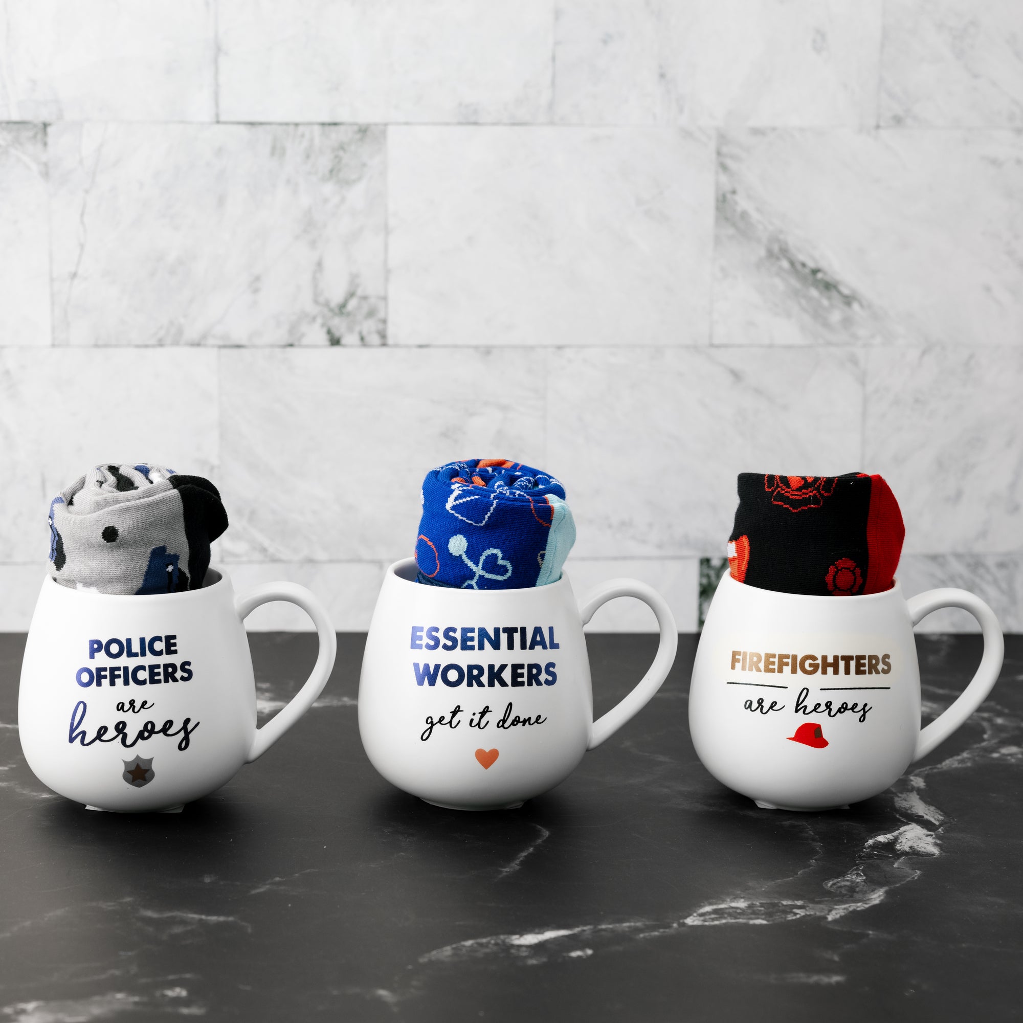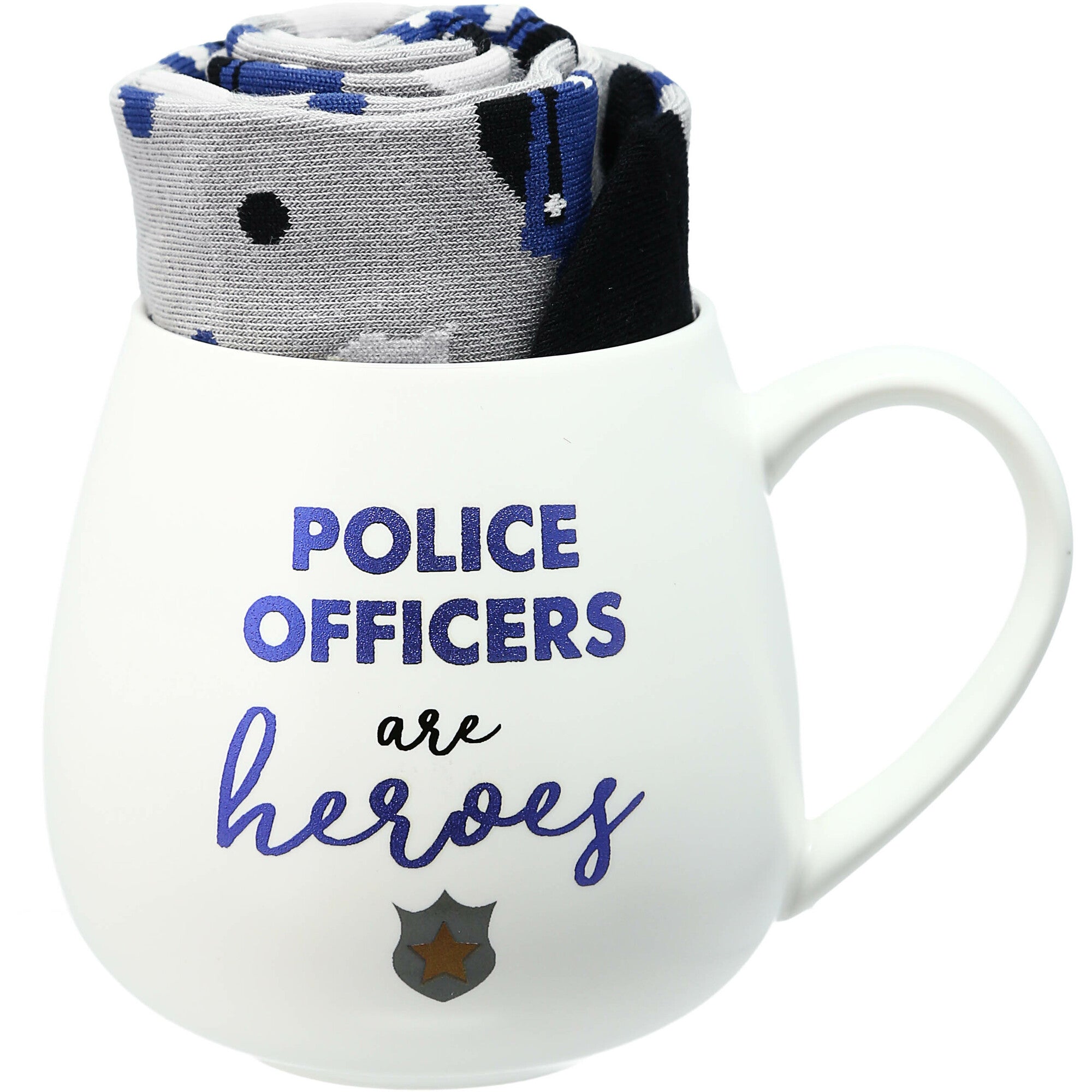 - IN-HOUSE DESIGN: Socks feature blue and black police hat with gray badges, accompanied by a black polka dot pattern on a gray background. The heals, toes, and ankles are solid black. The mug has blue and black "Police Officers Are Heroes" text and gold star badge decal is printed onto one side of the mug.