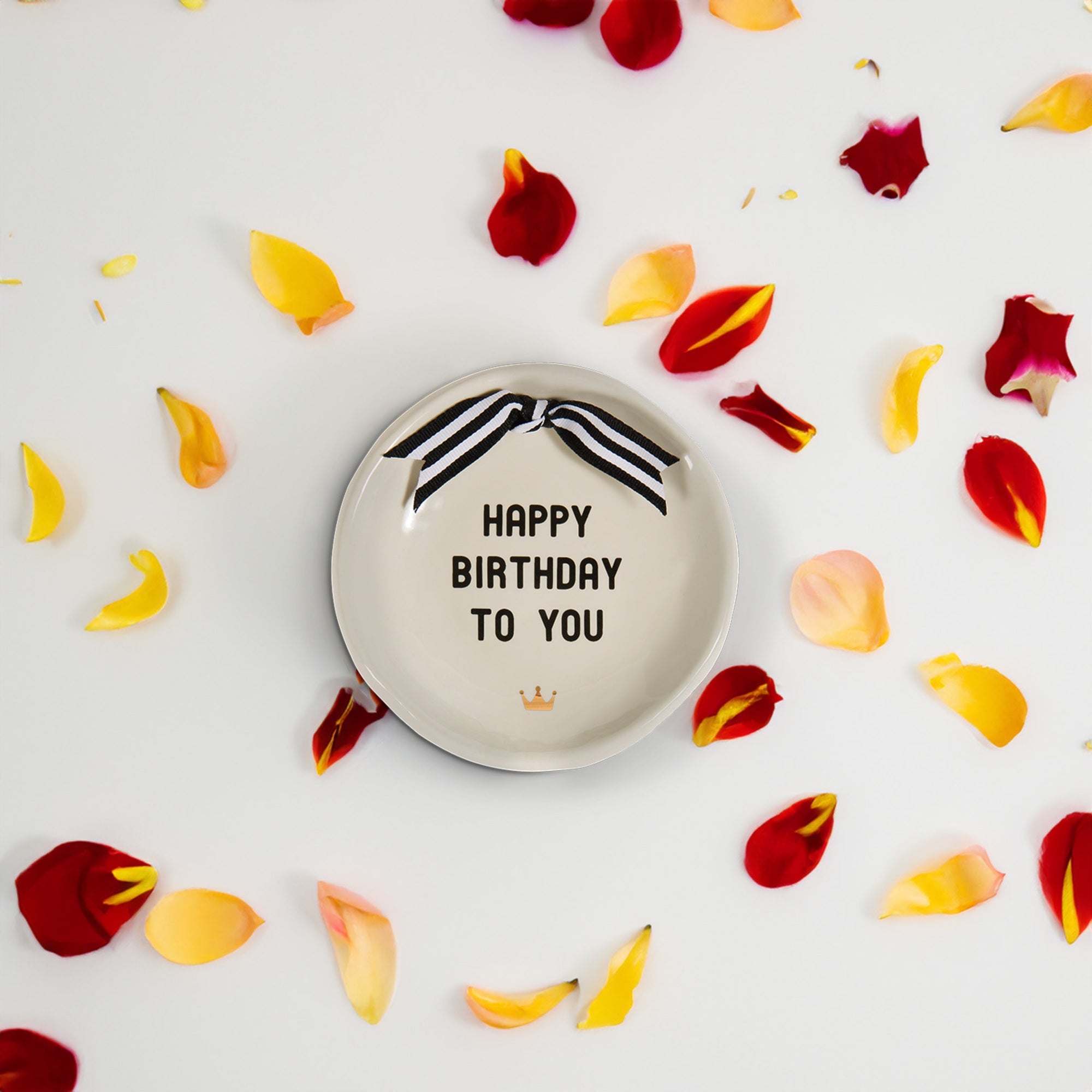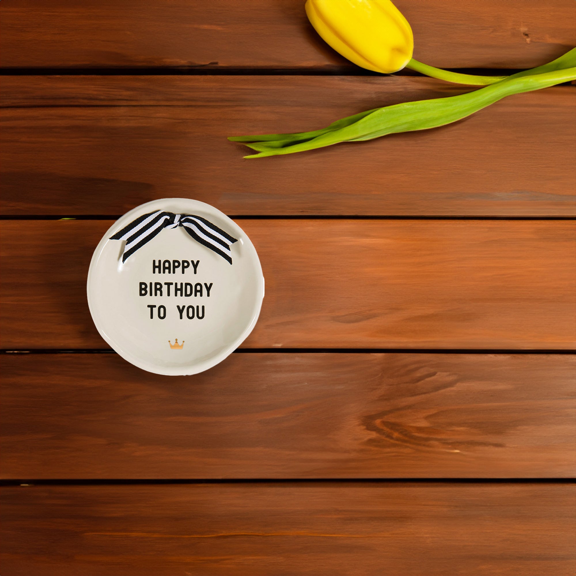• IN-HOUSE DESIGN: Featuring the cheerful inscription "Happy Birthday To You", this dish is adorned with a delicate golden crown accent, adding a regal touch to the design. The attached black-and-white striped ribbon enhances the presentation, making it a charming decorative piece for vanities, nightstands, or dressers.