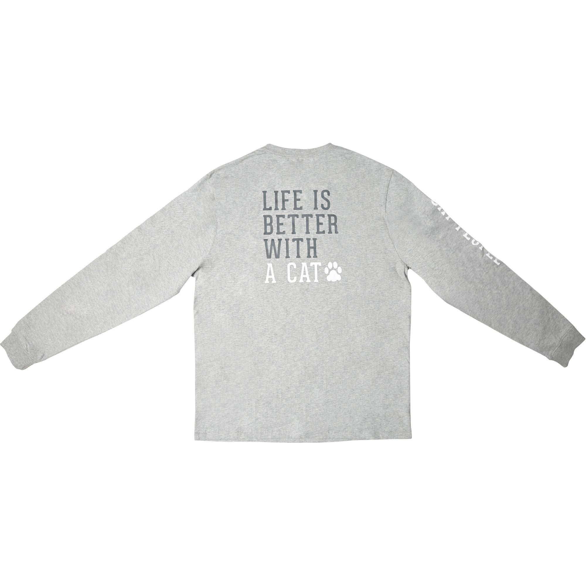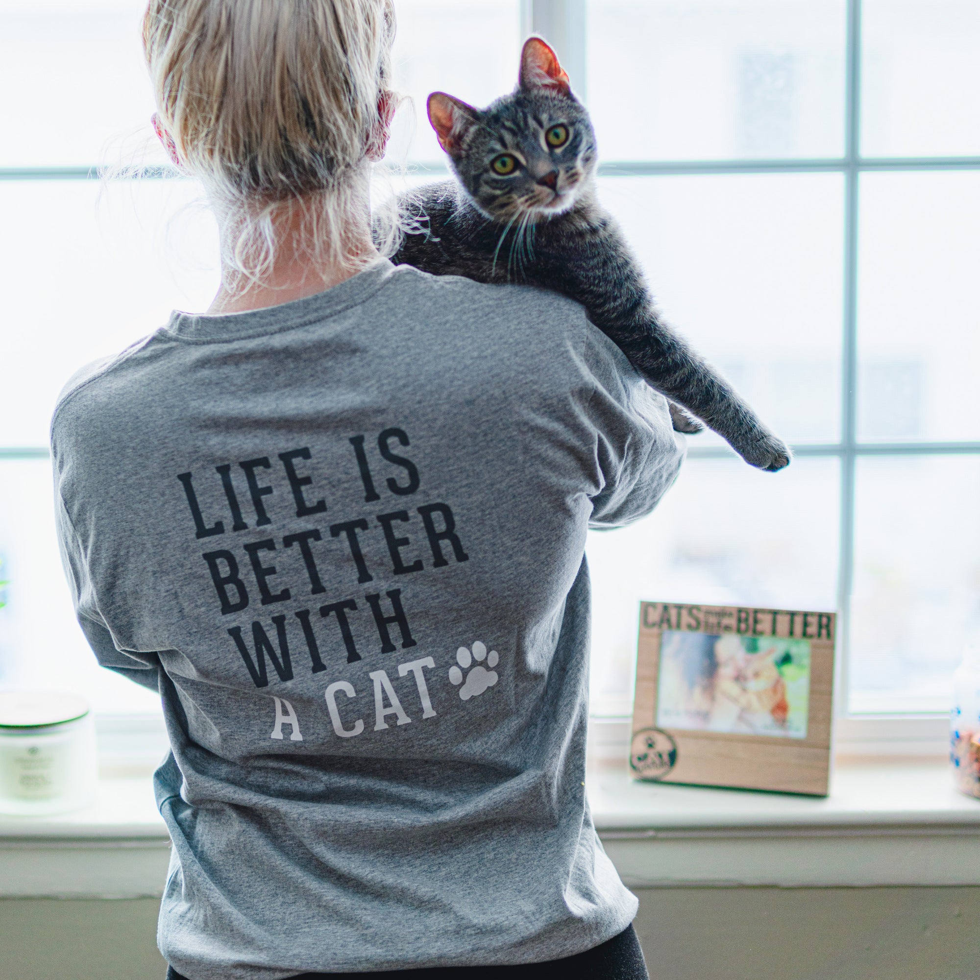 - IN-HOUSE DESIGN: Paw print icon on the front, "Cat People" text on the arm and "Life Is Better With A Cat" text on the back are all screen-printed onto the shirt.